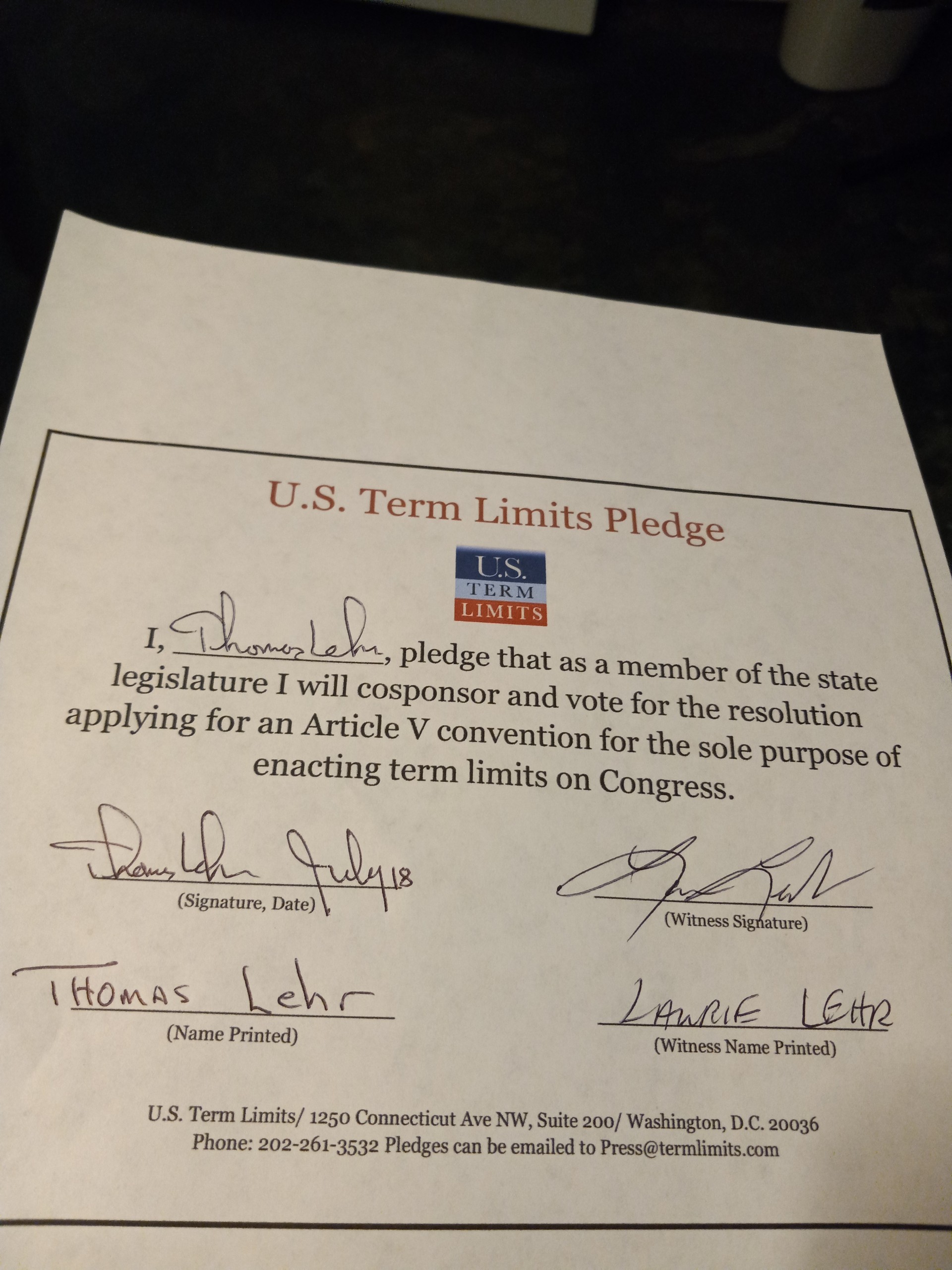 Tom Lehr Pledges to Support Congressional Term Limits