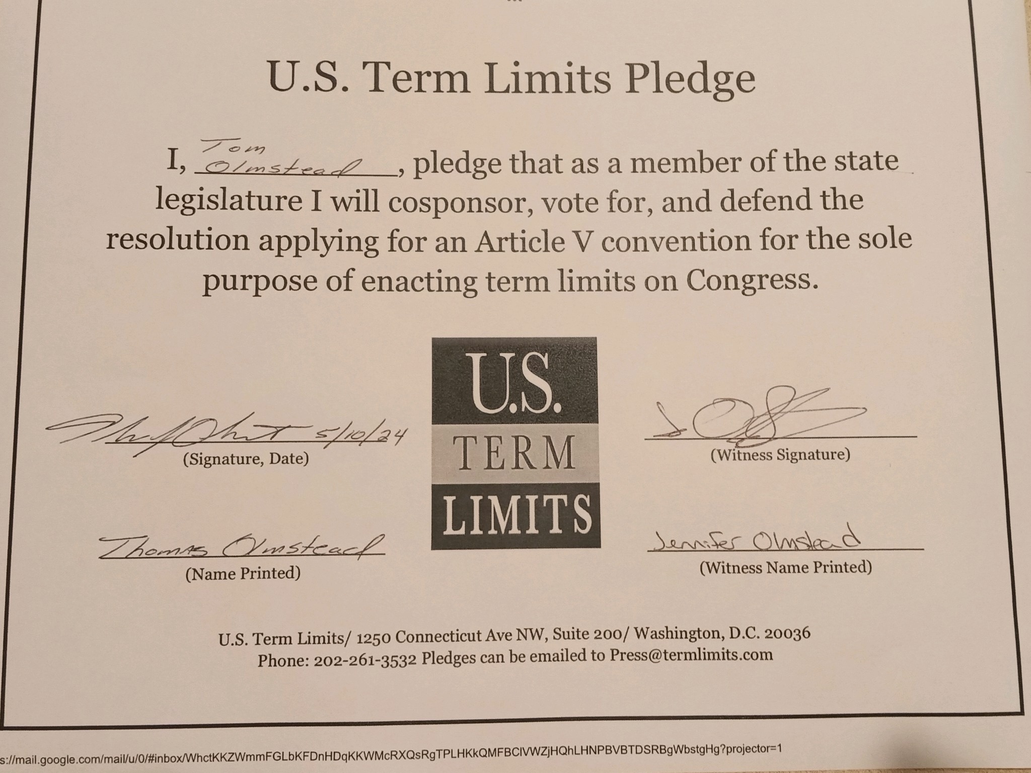 Tom Olmstead Pledges to Support Congressional Term Limits