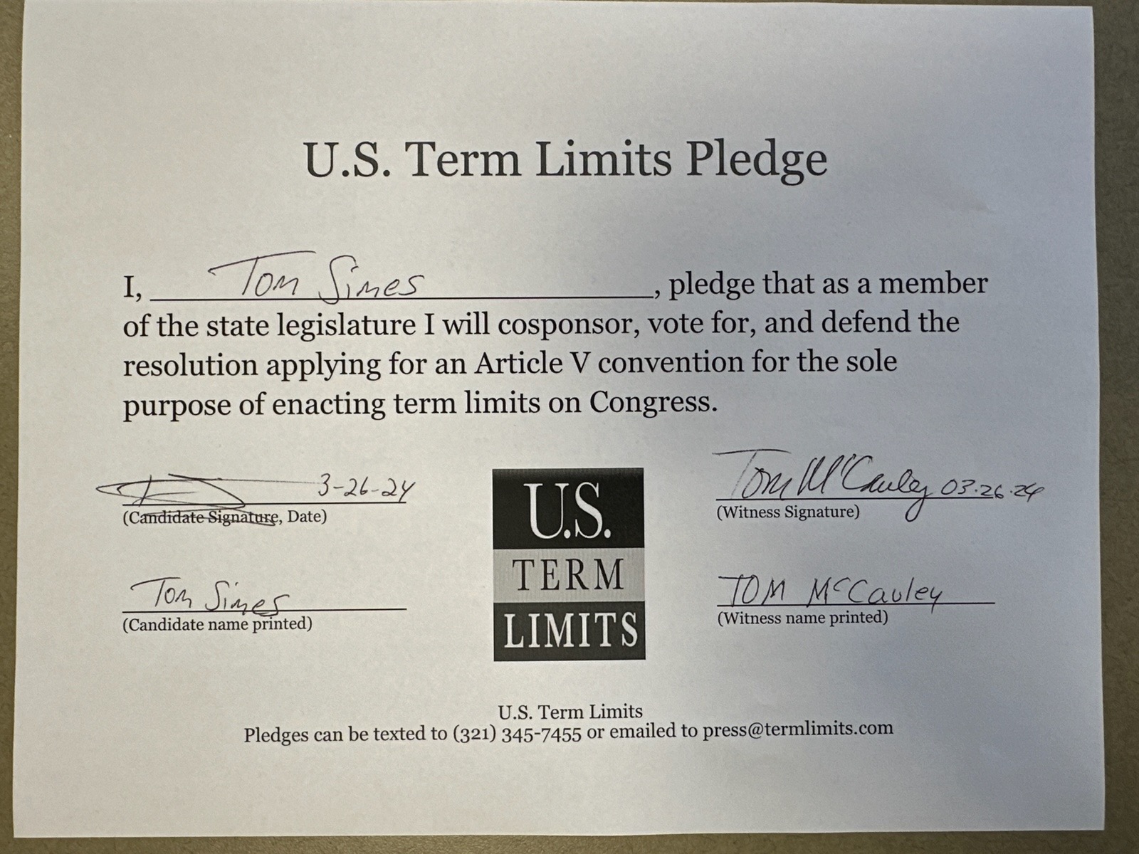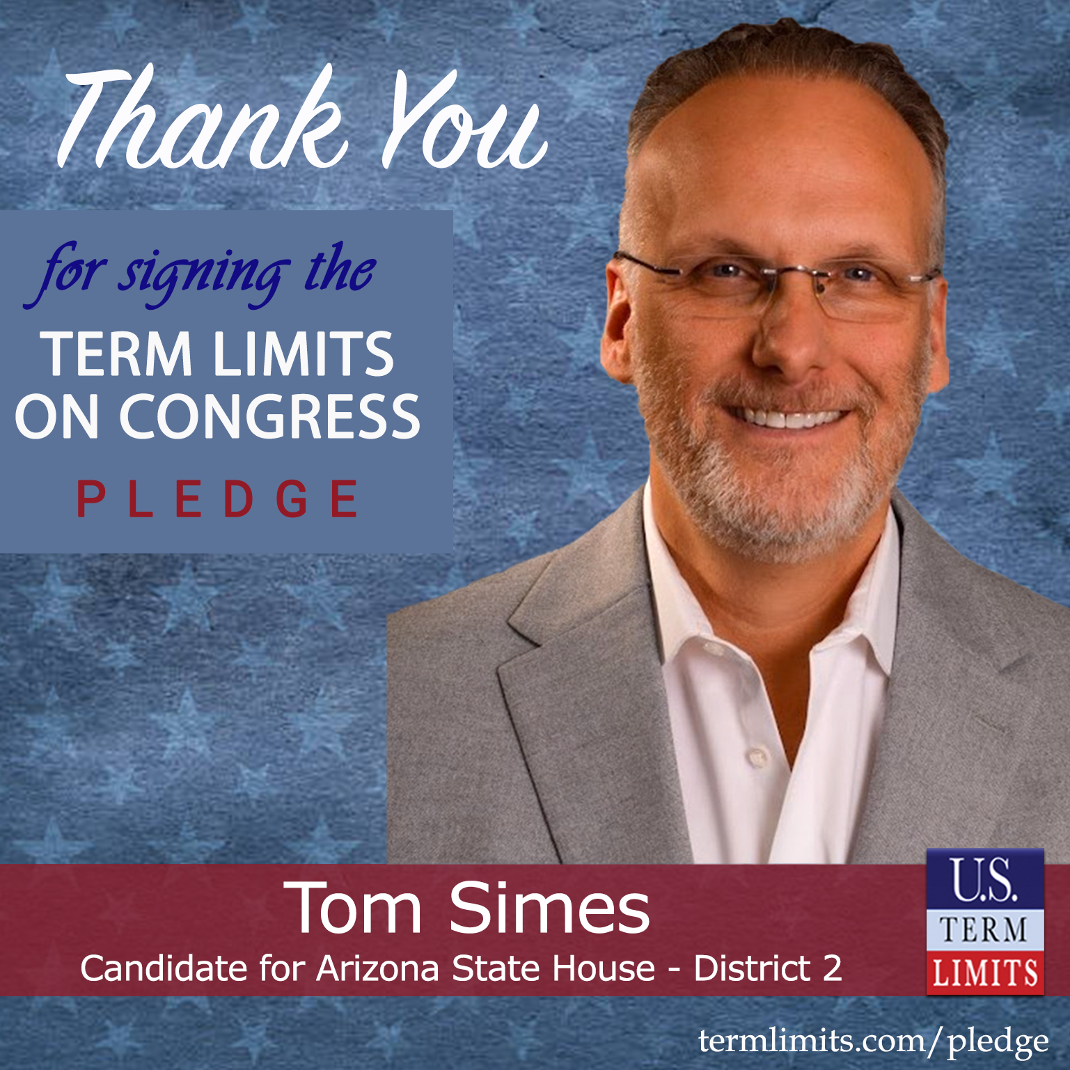 Deer Valley, AZ – U.S. Term Limits (USTL), the leader in the national, non-partisan movement to limit terms for elected officials, is gathering support from state lawmakers across the nation. Its mission is to get 34 states to apply for an amendment proposal convention specific to term limits on Congress. Arizona state house candidate, Tom Simes (District 2), has committed support for term limits on Congress by signing the term limits convention pledge. Previously, candidates Sergio Arellano and Ari Bradshaw also signed the pledge.