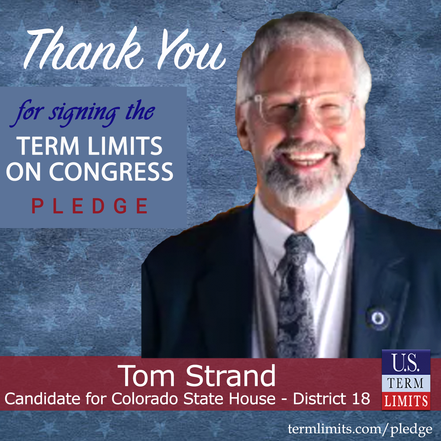 Colorado Springs, CO – U.S. Term Limits (USTL), the leader in the national, non-partisan movement to limit terms for elected officials, is gathering support from state lawmakers across the nation. Its mission is to get 34 states to apply for an amendment proposal convention specific to term limits on Congress. Colorado state house candidate, Tom Strand (District 18), has committed support for term limits on Congress by signing the term limits convention pledge. Strand is the first signer in this race.
