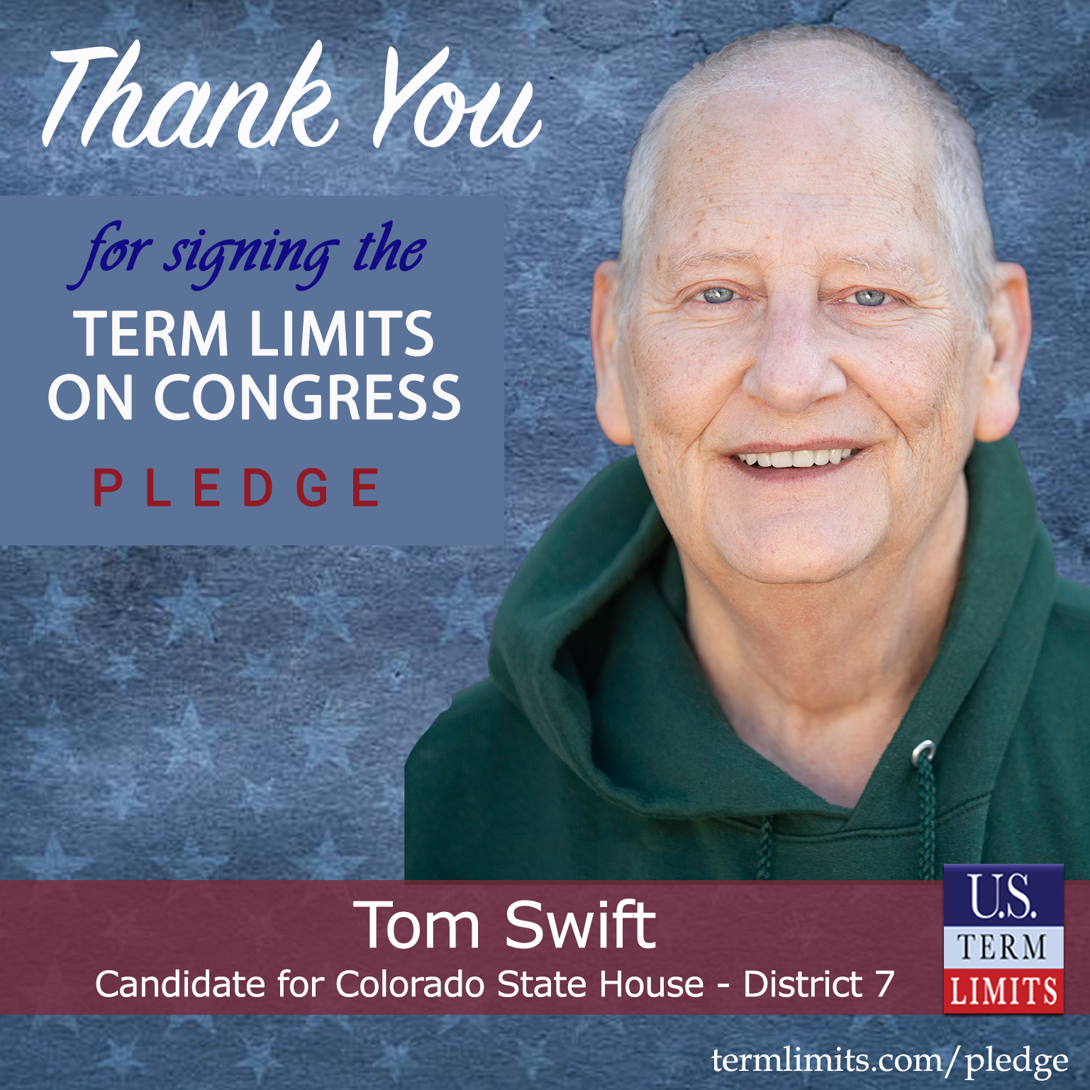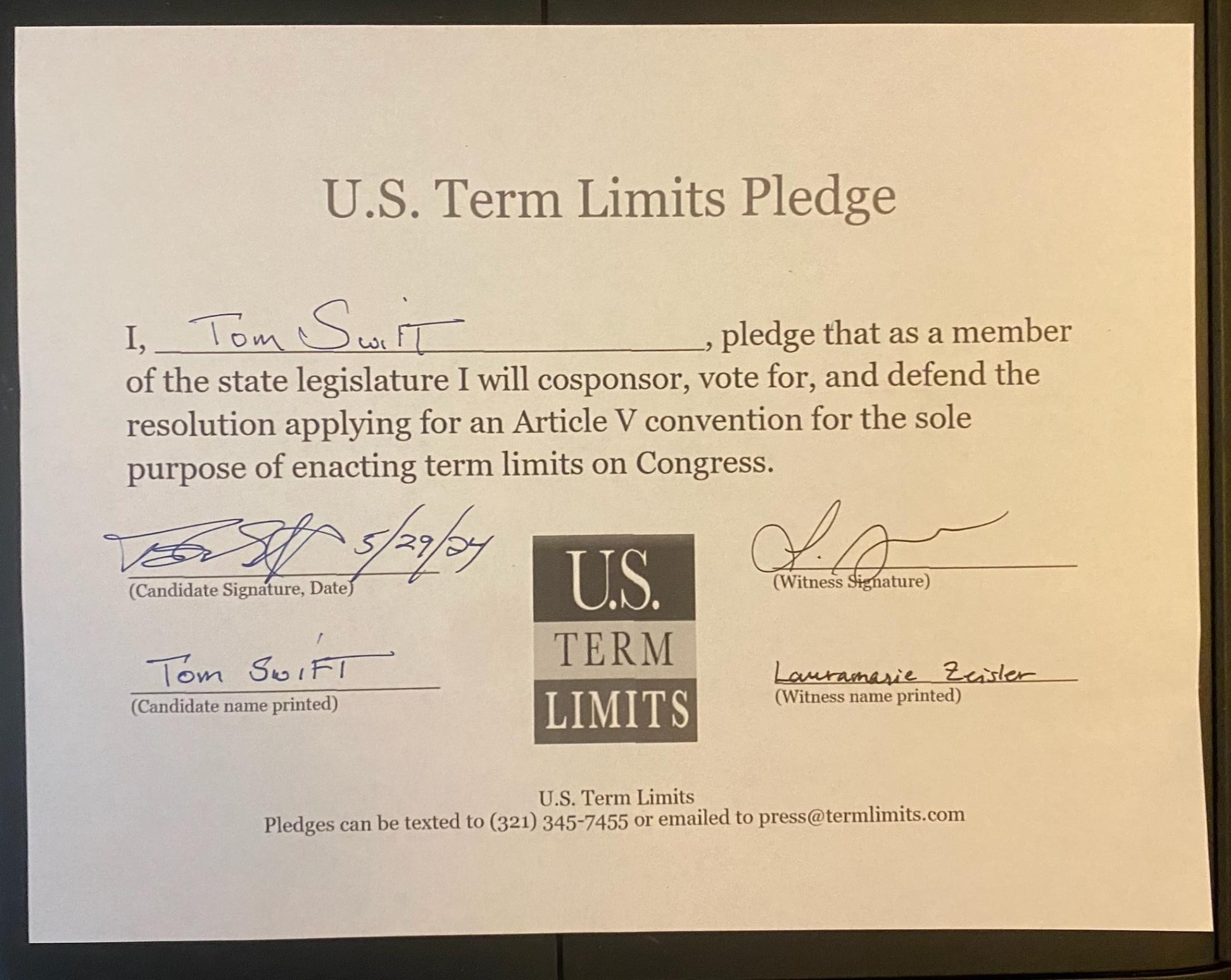 USTL President, Philip Blumel, commented on Swift’s pledge saying, “Tom’s strong support of term limits shows that there are individuals who are willing to listen to the majority of voters who want term limits. America needs a Congress that will be served by citizen legislators, not career politicians.”