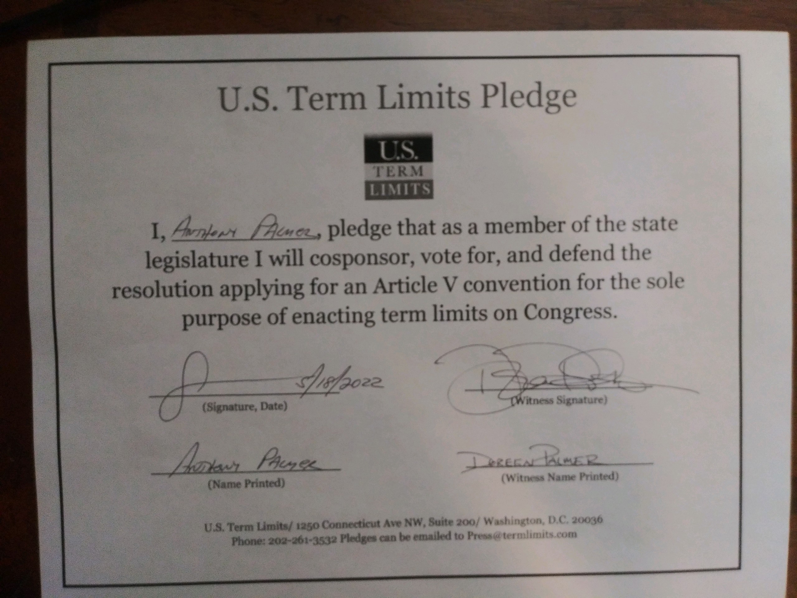 Tony Palmer Pledges to Support Congressional Term Limits