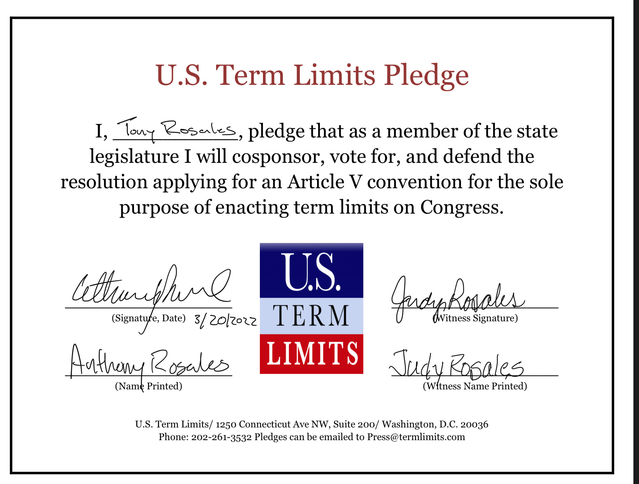“Term limits is critical for the future of our country. I am glad Tony has signed the pledge in supporting term limits on Congress. It shows that he understands the importance of the vision of our founding fathers and fixing DC,” says Ed Walker, State Chair for U.S. Term Limits.