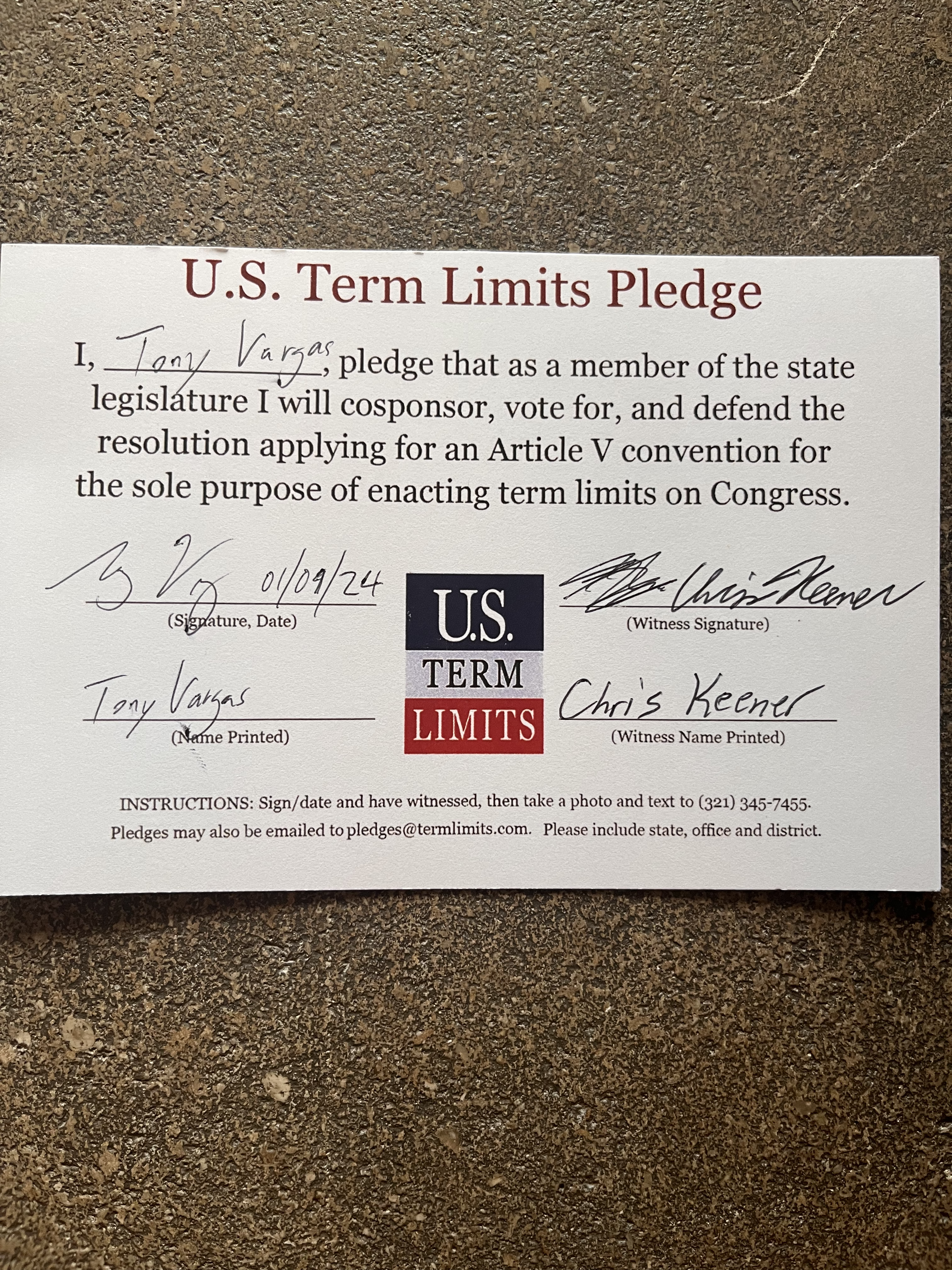 USTL President, Philip Blumel, commented on Vargas’s pledge saying, “Tony’s strong support of term limits shows that there are individuals who are willing to listen to the majority of voters who want term limits. America needs a Congress that will be served by citizen legislators, not career politicians.”