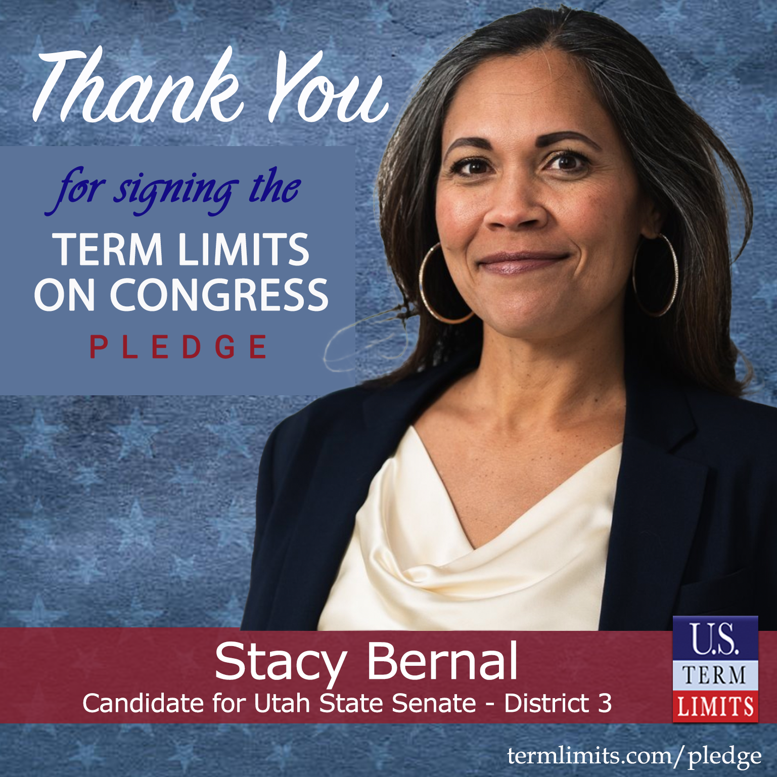 Ogden, UT – U.S. Term Limits (USTL), the leader in the national, non-partisan movement to limit terms for elected officials, is gathering support from state lawmakers across the nation. Its mission is to get 34 states to apply for an amendment proposal convention specific to term limits on Congress. Utah state senate candidate, Tracy Bernal (District 3), has committed support for term limits on Congress by signing the Term Limits Convention Pledge.