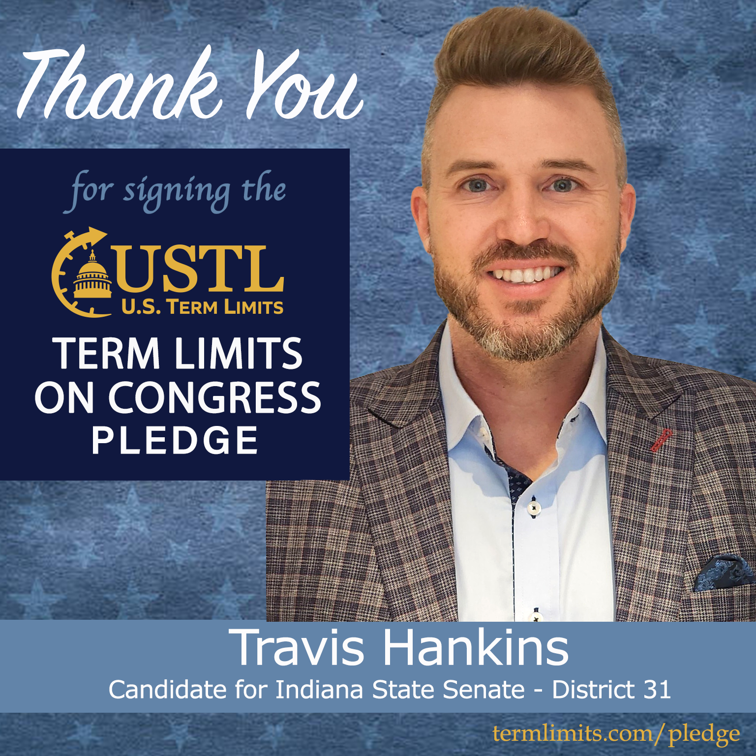 Fishers, IN – U.S. Term Limits (USTL), the leader in the national, non-partisan movement to limit terms for elected officials, is gathering support from state lawmakers across the nation. Its mission is to get 34 states to apply for an amendment proposal convention specific to term limits on Congress. Indiana state senate candidate, Travis Hankins (district 31), has committed support for term limits on Congress by signing the term limits convention pledge.