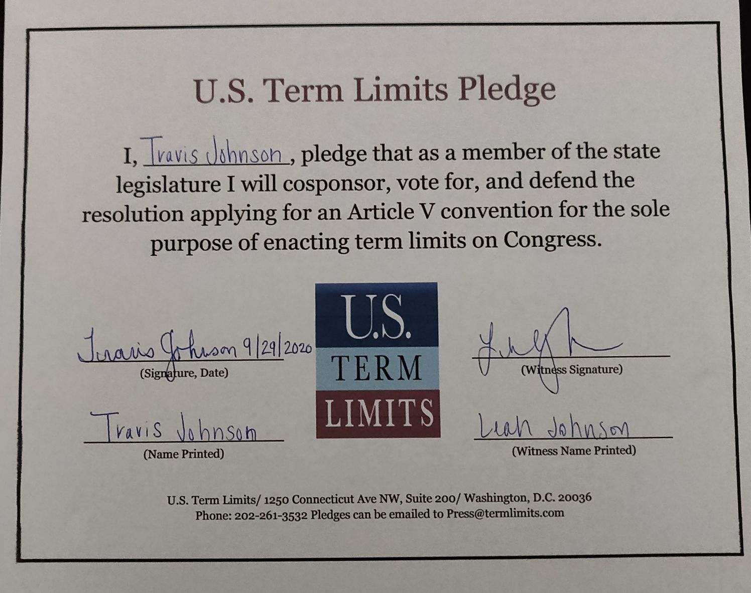 USTL President, Philip Blumel, commented on Johnson’s pledge saying, “Travis’s support of term limits shows that there are individuals who are willing to listen to the majority of voters who want term limits. America needs a Congress that will be served by citizen legislators, not career politicians.”