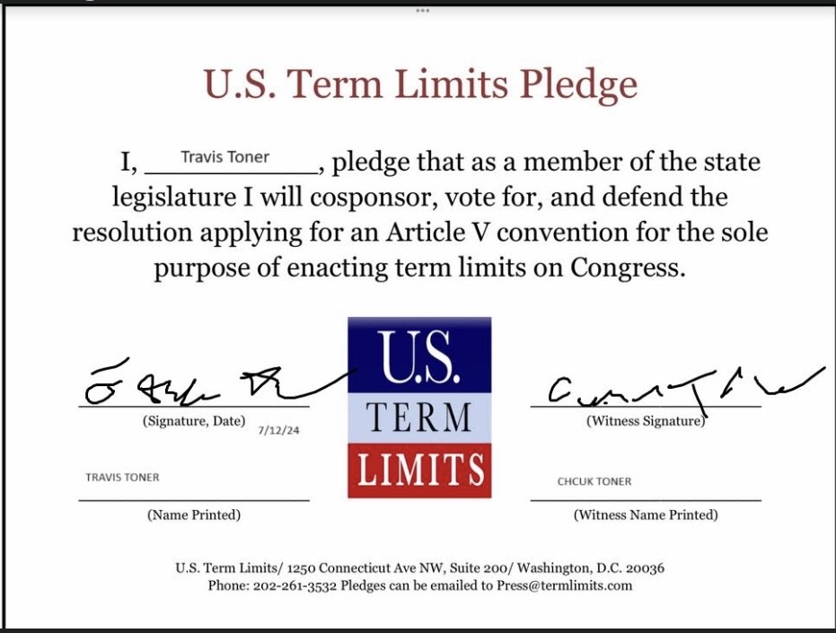 Belmont, NH – U.S. Term Limits (USTL), the leader in the national, non-partisan movement to limit terms for elected officials, is gathering support from state lawmakers across the nation. Its mission is to get 34 states to apply for an amendment proposal convention specific to term limits on Congress. New Hampshire state house candidate, Travis Toner (Belknap 4 district), has committed support for term limits on Congress by signing the term limits convention pledge. Previously, incumbent Rep. Travis O’Hara also signed the pledge.