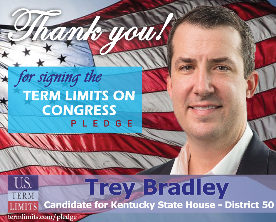 Lexington, KY – U.S. Term Limits (USTL), the leader in the national, non-partisan movement to limit terms for elected officials, is gathering support from state lawmakers across the nation. Its mission is to get 34 states to apply for an amendment proposal convention specific to term limits on Congress. Kentucky state house candidate, Trey Bradley (district 50), has committed support for term limits on Congress by signing the Term Limits Convention pledge. Bradley is the first signer in this race.