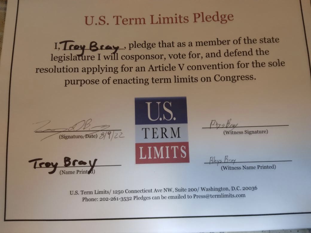 USTL President, Philip Blumel, commented on Bray’s pledge saying, “Troy’s support of term limits shows that there are individuals who are willing to listen to the majority of voters who want term limits. America needs a Congress that will be served by citizen legislators, not career politicians.”