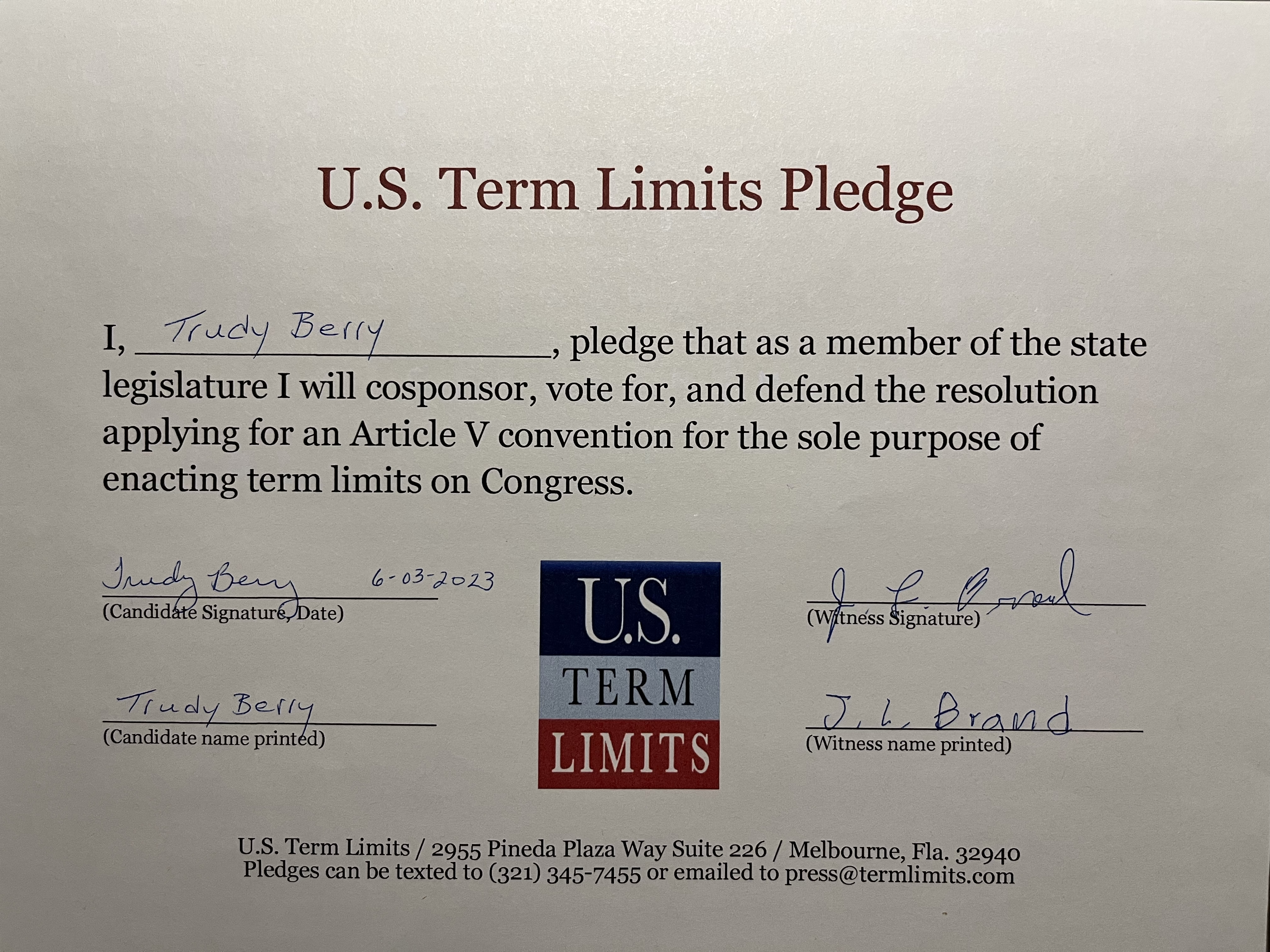 USTL President, Philip Blumel, commented on Berry’s pledge saying, “Trudy’s strong support of term limits shows that there are individuals who are willing to listen to the majority of voters who want term limits. America needs a Congress that will be served by citizen legislators, not career politicians.”