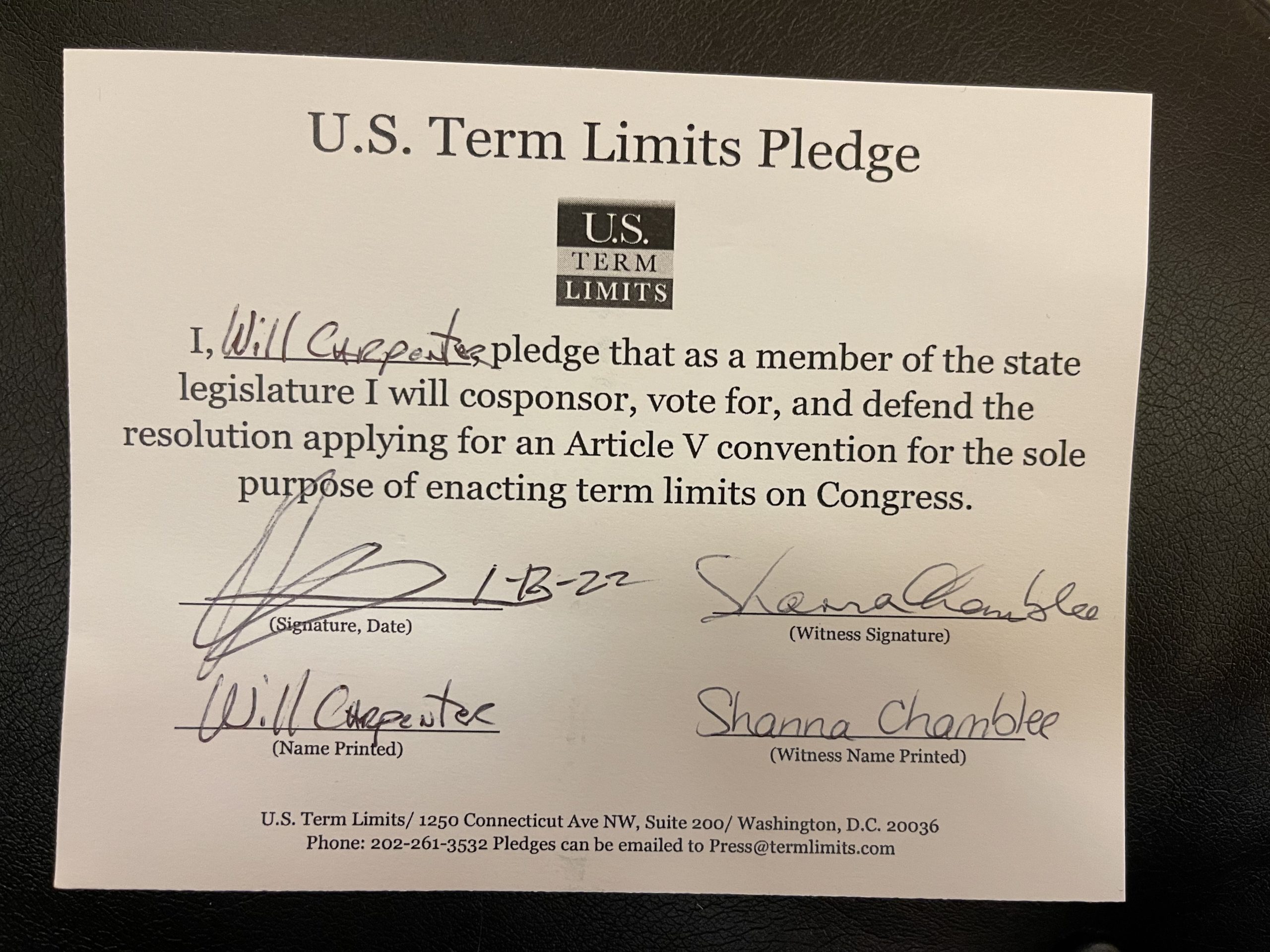 The U.S. Term Limits pledge is provided to candidates and members of state legislatures. It reads, “I pledge that, as a member of the state legislature, I will cosponsor, vote for, and defend the resolution applying for an Article V convention for the sole purpose of enacting term limits on Congress.”