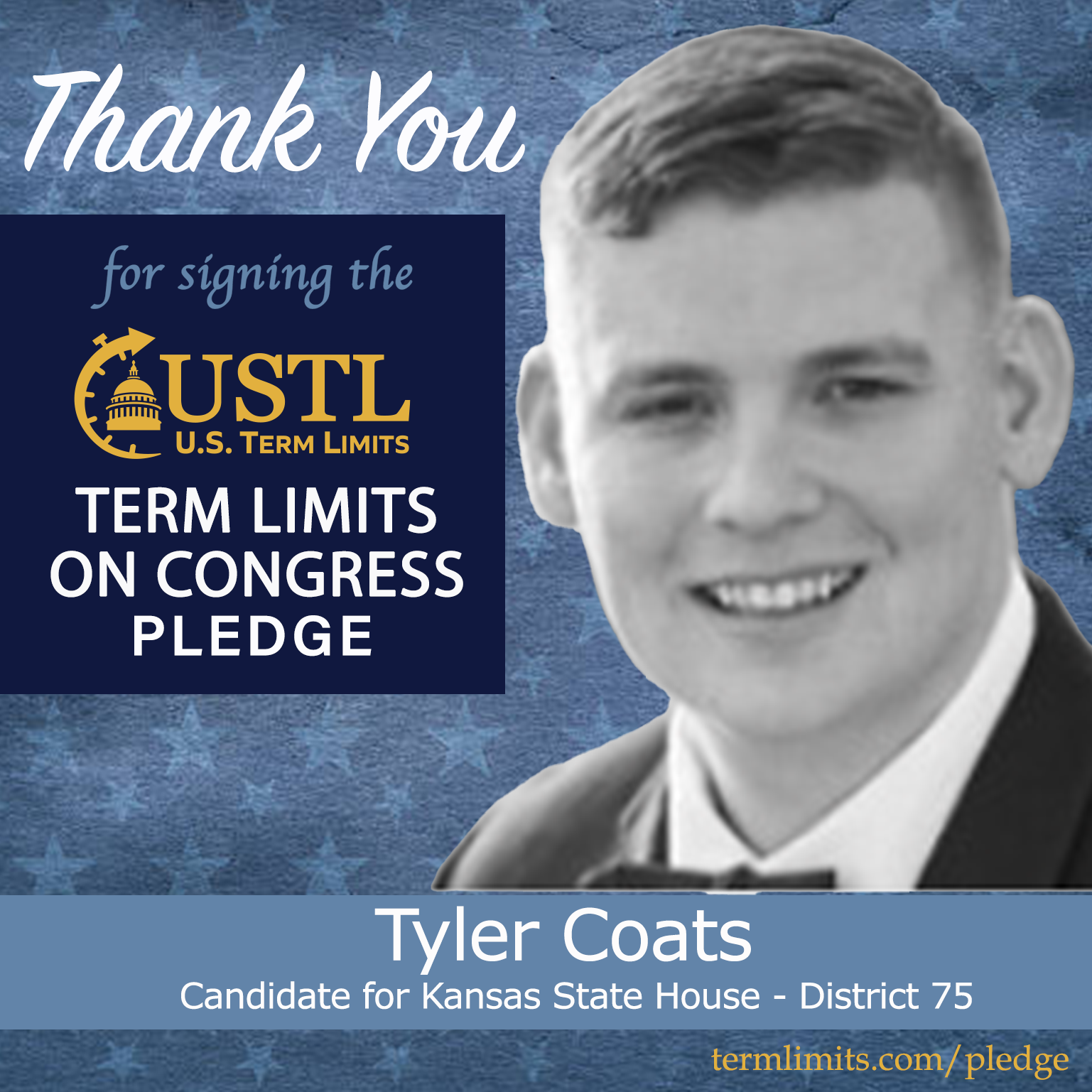 Potwin, KS – U.S. Term Limits (USTL), the leader in the national, non-partisan movement to limit terms for elected officials, is gathering support from state lawmakers across the nation. Its mission is to get 34 states to apply for an amendment proposal convention specific to term limits on Congress. Kansas state house candidate, Tyler Coats (district 75), has committed support for term limits on Congress by signing the term limits convention pledge. Previously, incumbent Rep. Will Carpenter also signed the pledge.