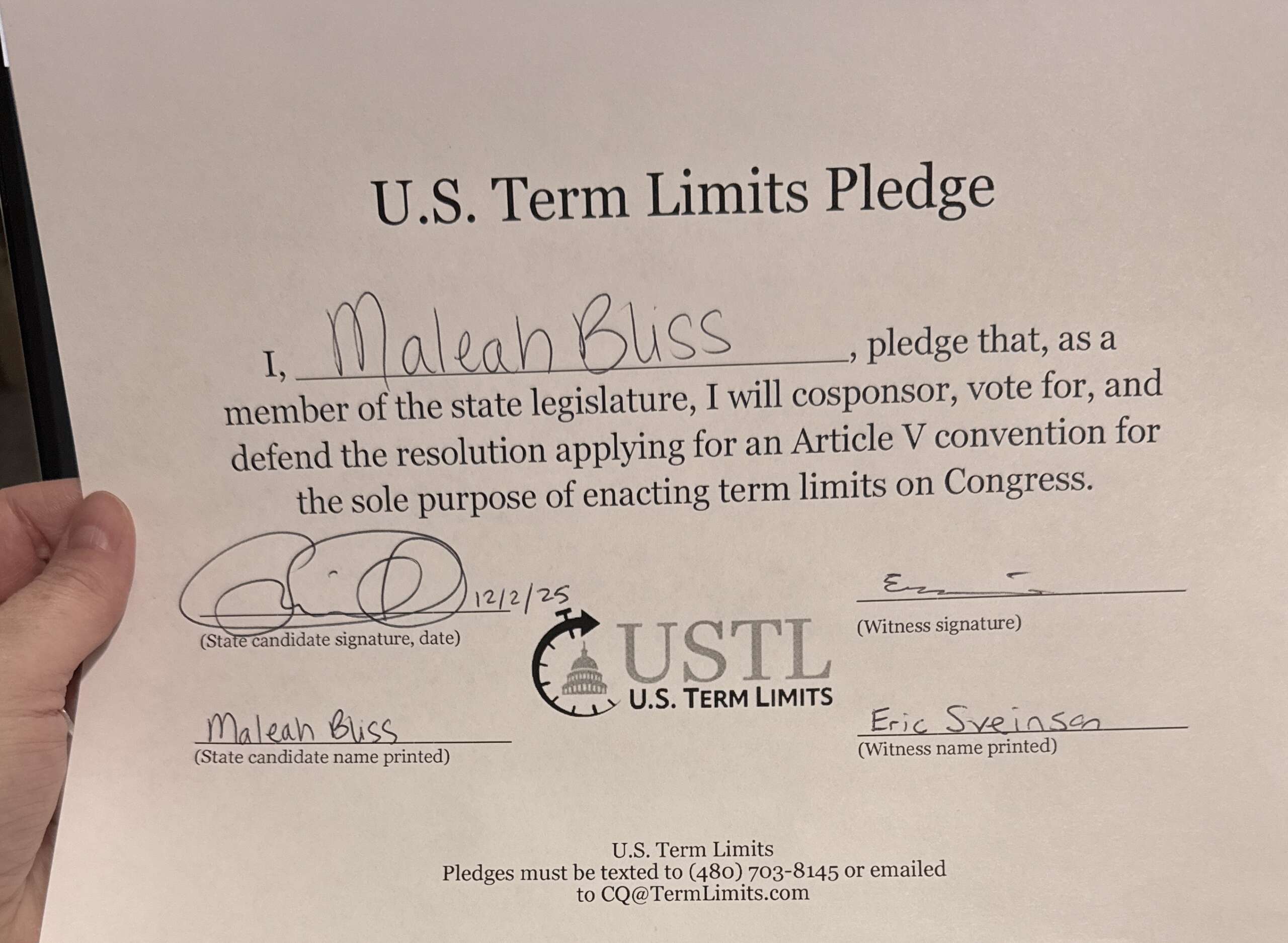 West Valley City, UT – U.S. Term Limits (USTL), the leader in the national, non-partisan movement to limit terms for elected officials, is gathering support from state lawmakers across the nation. Its mission is to get 34 states to apply for an amendment proposal convention specific to term limits on Congress. Utah state senate candidate, Tynley Bean (District 11), has committed support for term limits on Congress by signing the term limits convention pledge. Previously, candidate Maleah Bliss also signed the pledge.