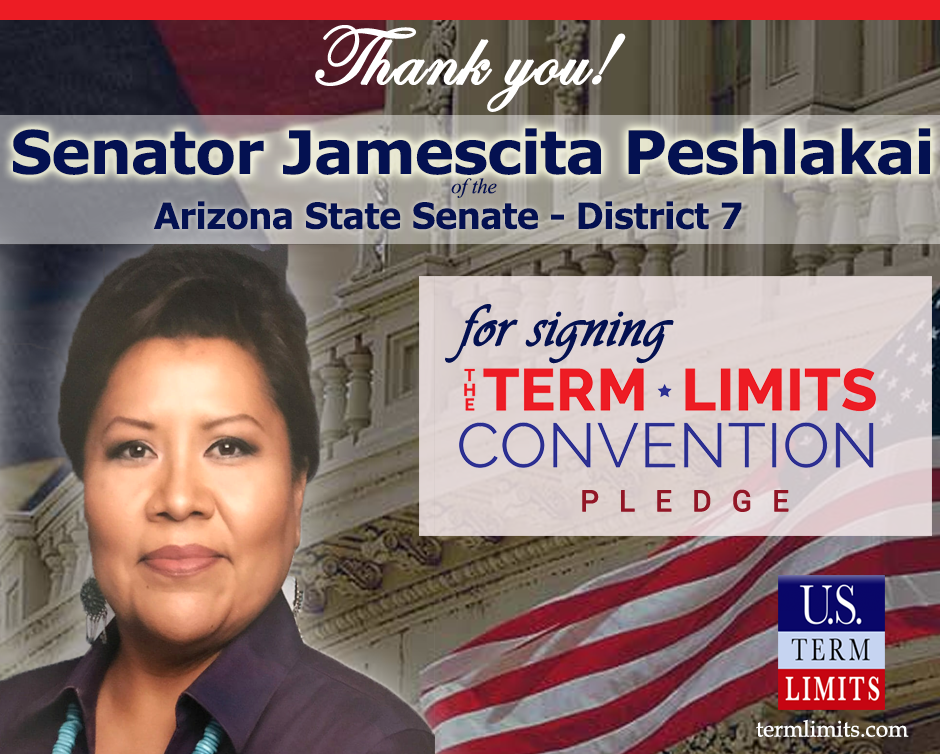 Mesa, AZ – U.S. Term Limits (USTL), the leader in the national, non-partisan movement to limit terms for elected officials, is gathering support from state lawmakers across the nation. Its mission is to get 34 states to apply for an amendment proposal convention specific to term limits on Congress. Arizona state senator Jamescita Peshlakai (State Senate District 7) has committed support for term limits on Congress by signing the Term Limits convention pledge.