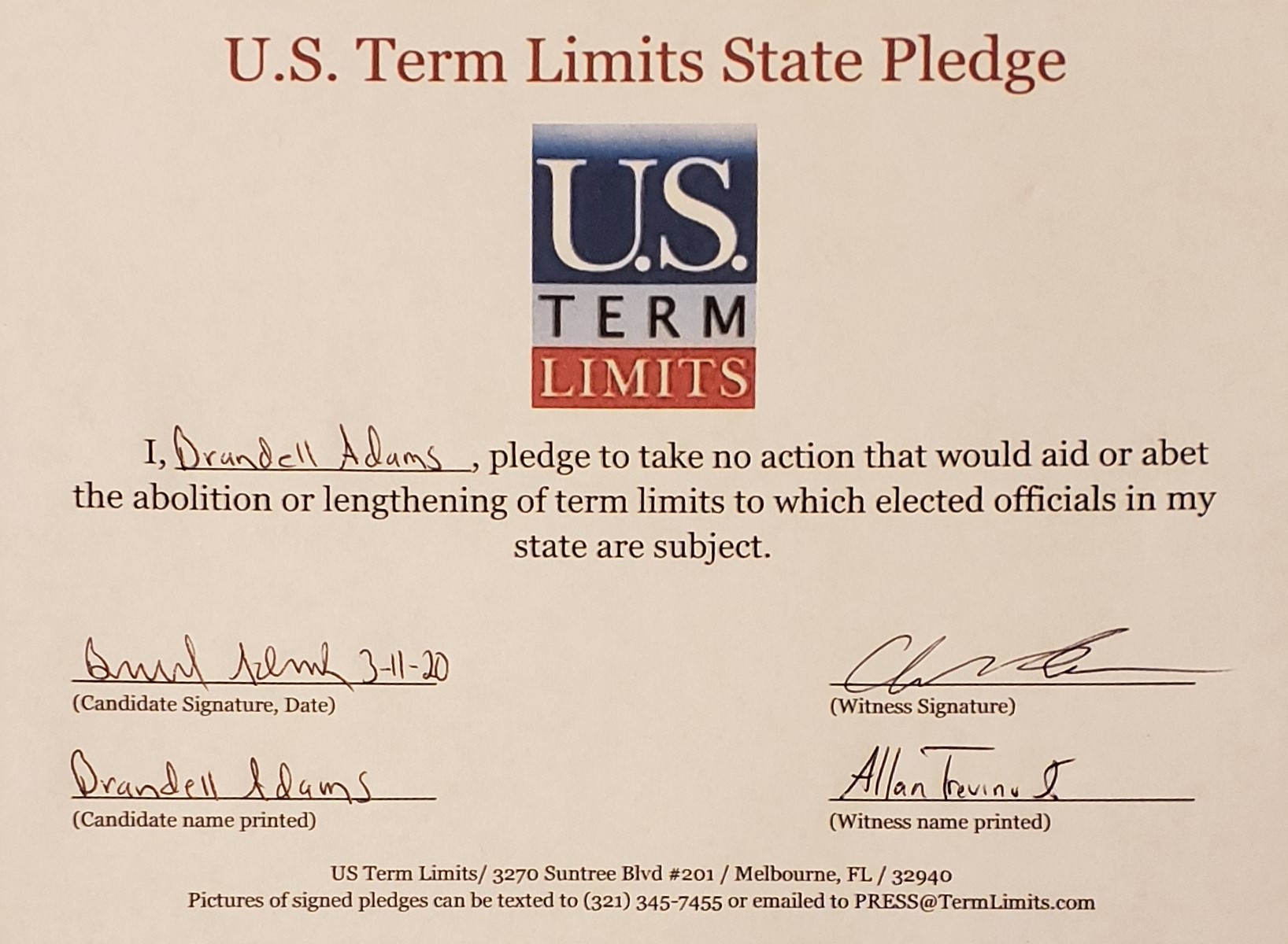 U.S. Term Limits Praises Brandell Adams for Signing Pledge