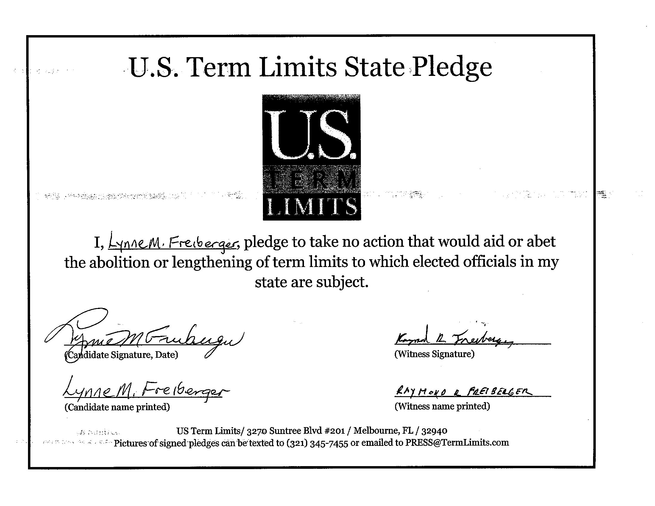 The pledge is provided to candidates and elected officials statewide. It reads, “I pledge to take no action that would aid or abet the abolition or lengthening of term limits to which elected officials in my state are subject.”