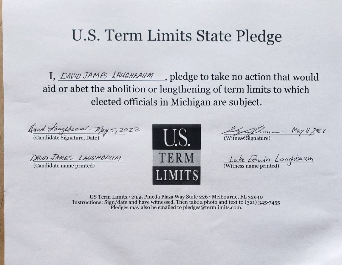 Detroit, MI – U.S. Term Limits (USTL), the leader in the national, non-partisan movement to limit terms for elected officials, is gathering support from lawmakers and candidates across Michigan. Its mission is to advocate for term limits on all elected officials. State house candidate, David Laughbaum of district 88, has committed to defend term limits in Michigan by signing the term limits pledge.  The primary election is scheduled for August 2, 2022.