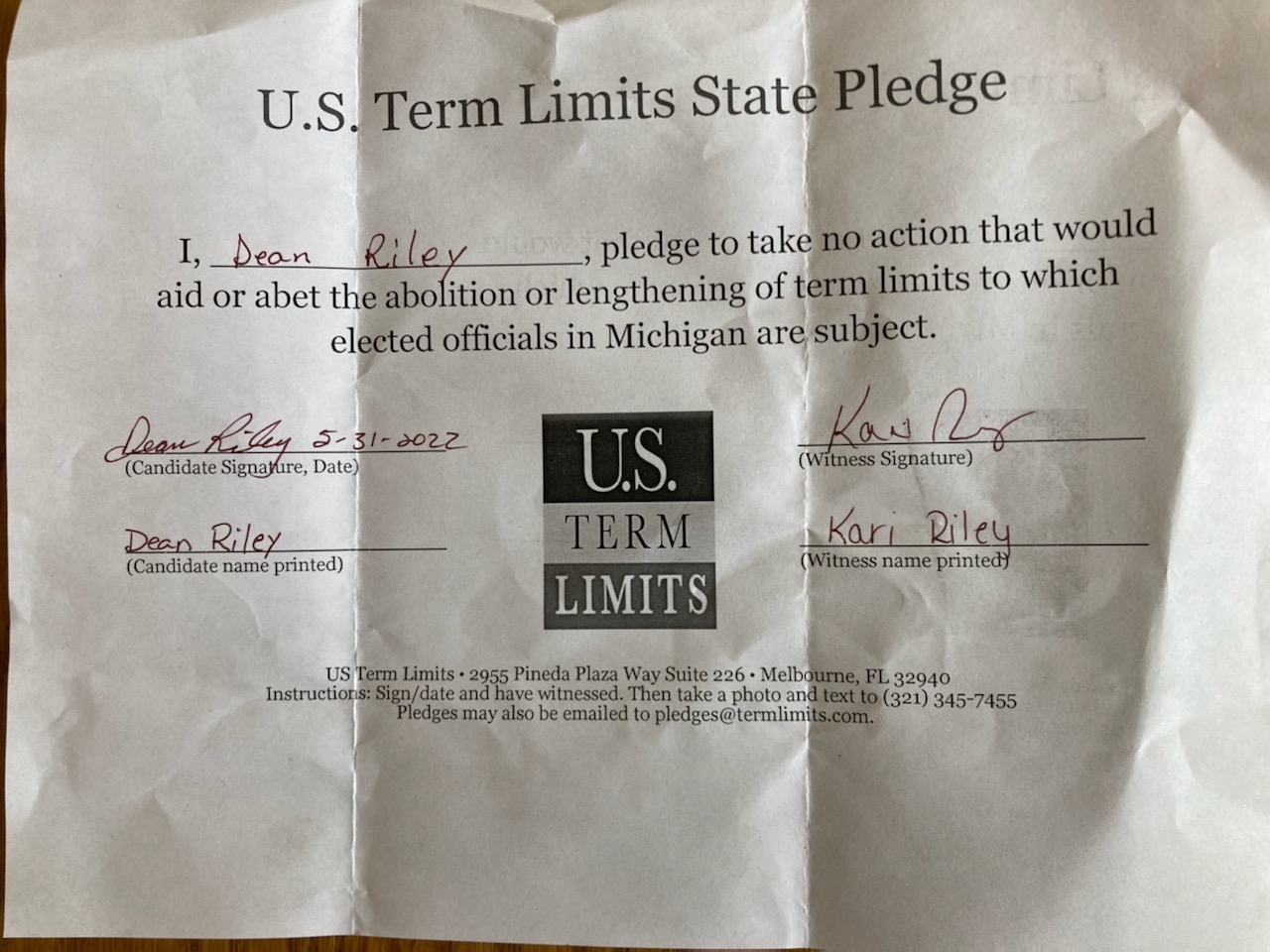 USTL President, Philip Blumel, commented on Riley’s pledge saying, “Dean’s support of term limits shows that there are individuals who are willing to listen to the majority of voters who want term limits. The people are best served by citizen legislators, not career politicians.”