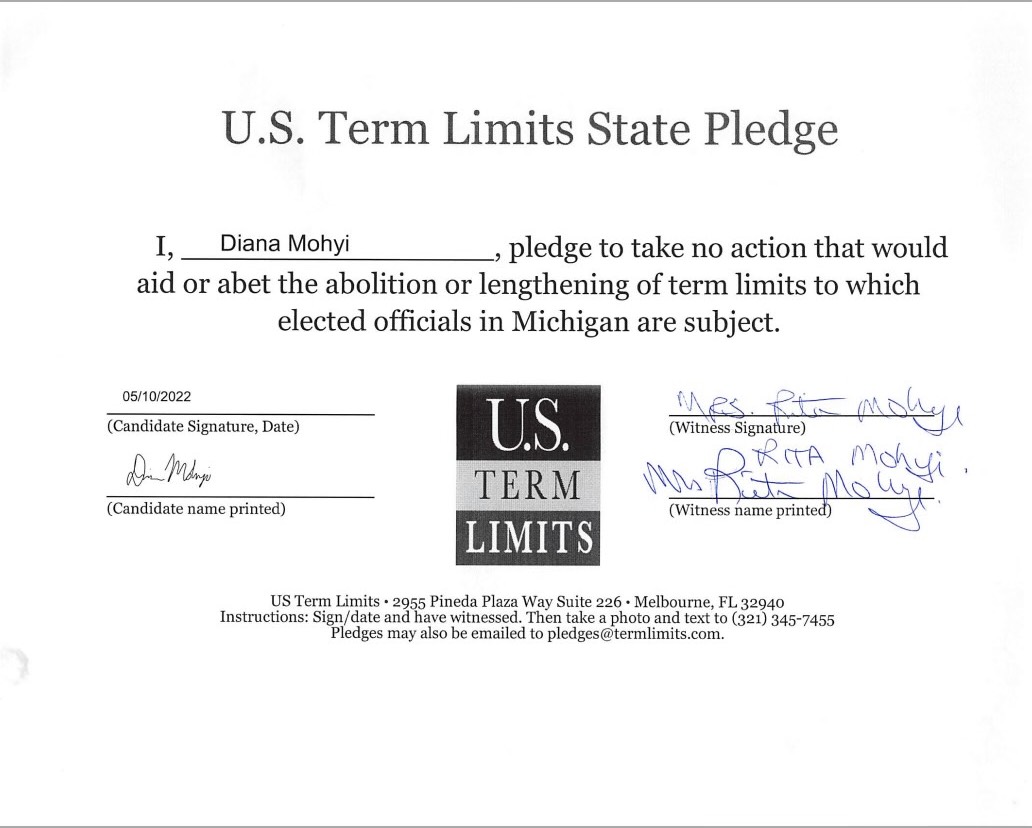 Detroit, MI – U.S. Term Limits (USTL), the leader in the national, non-partisan movement to limit terms for elected officials, is gathering support from lawmakers and candidates across Michigan. Its mission is to advocate for term limits on all elected officials. State house candidate, Diana Mohyi of district 20, has committed to defend term limits in Michigan by signing the term limits pledge. The primary election is scheduled for August 2, 2022.