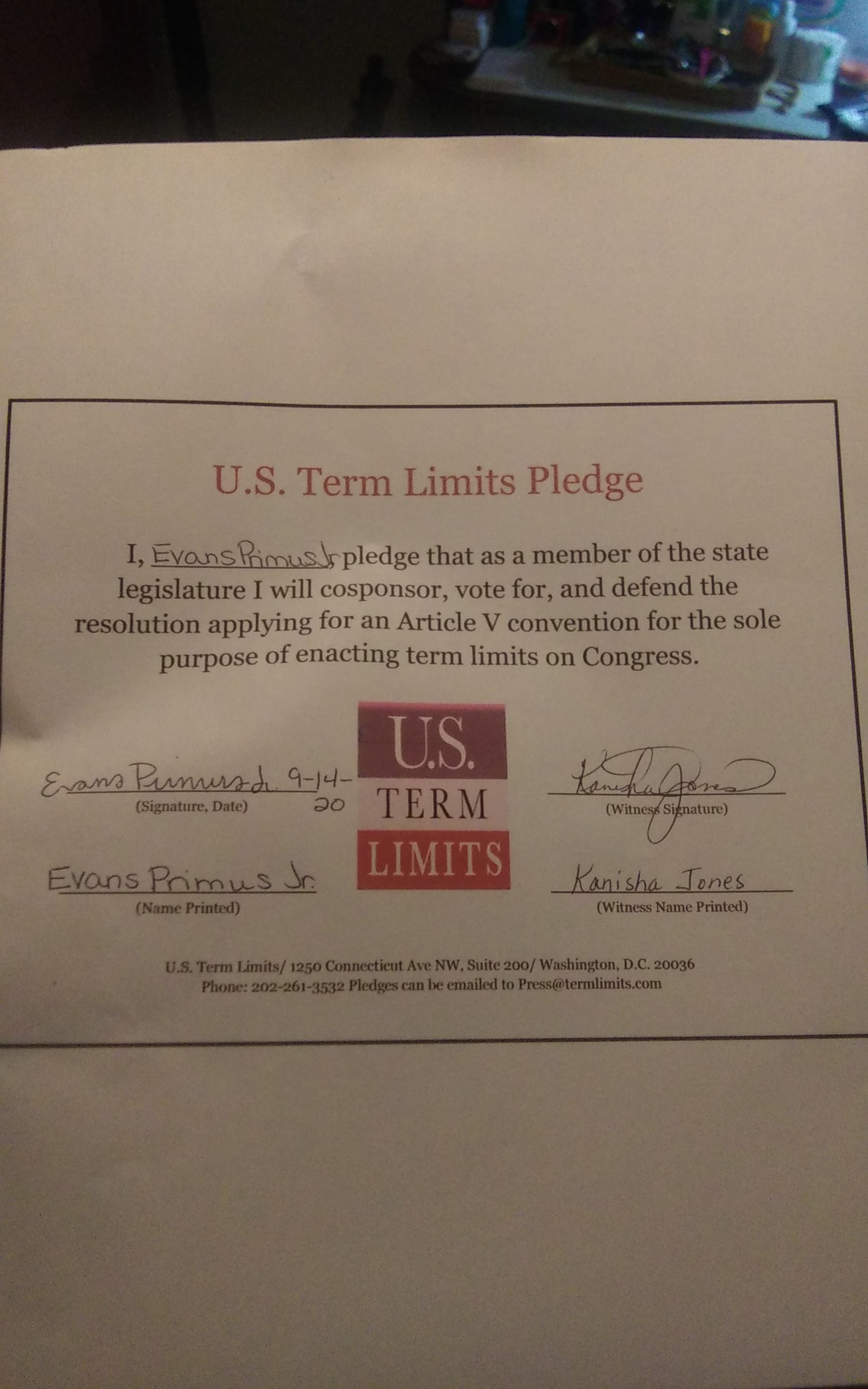 U.S. Term Limits Praises GA Candidate Evans Primus for Signing Pledge