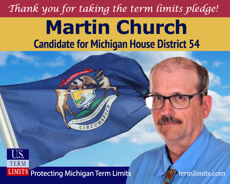 Lansing, MI – U.S. Term Limits (USTL), the leader in the national, non-partisan movement to limit terms for elected officials, is gathering support from elected officials across Michigan. Its mission is to advocate for term limits on all elected officials. State house candidate, Martin Church of district 54, has committed to defend term limits in Michigan by signing the term limits pledge.