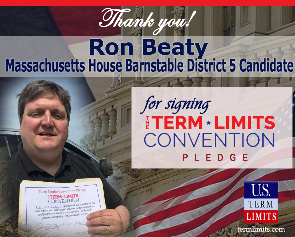 Washington, D.C. – U.S. Term Limits (USTL), the leader in the national movement to limit terms for elected officials, is currently gathering support from state lawmakers across the nation. Its mission is to get 34 states to apply for an amendment proposal convention specifically to enact term limits on Congress. Massachusetts State House candidate, Ron Beaty (District 5), is the first in his district to sign the Article V Term Limits Convention Pledge.