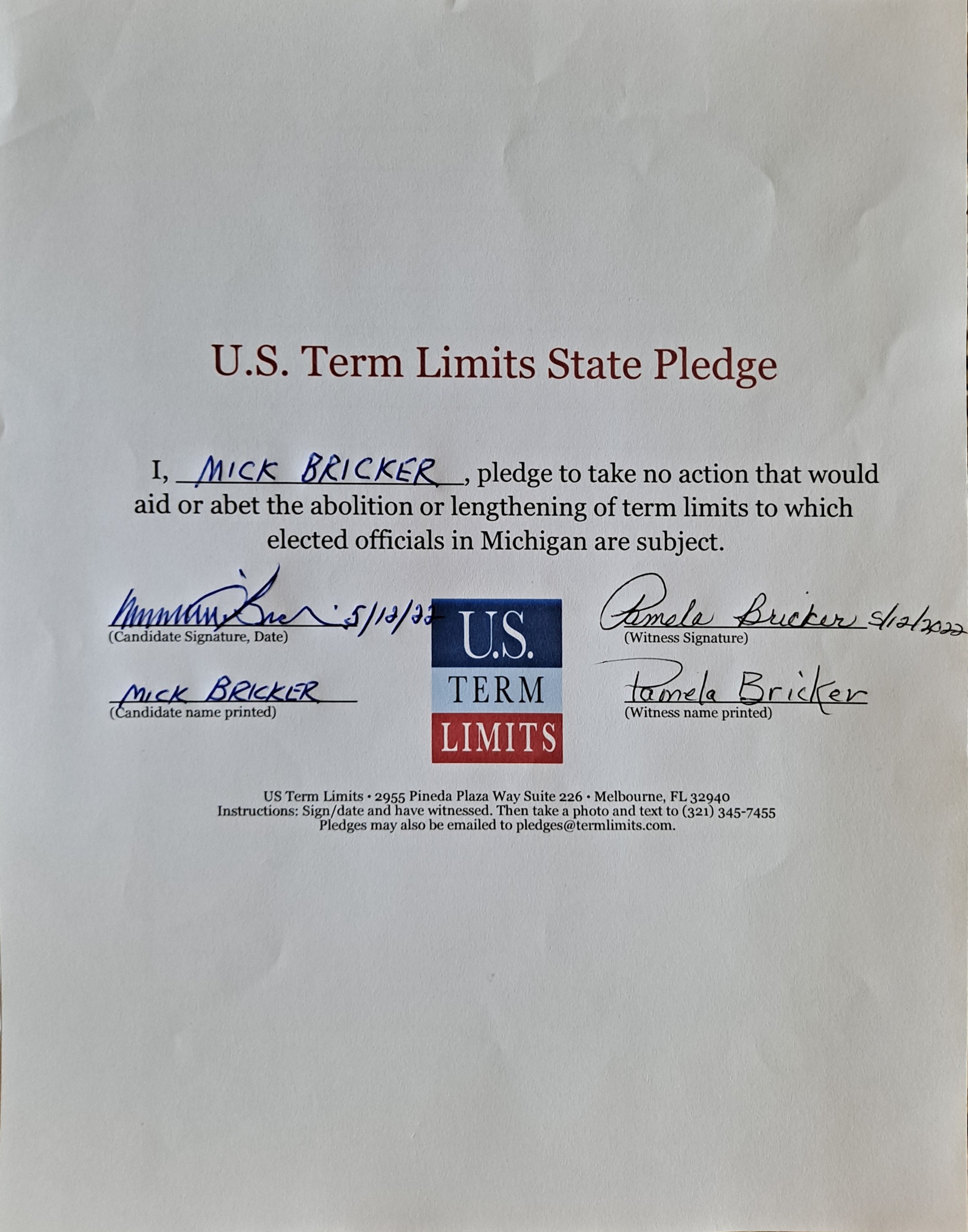U.S. Term Limits Praises Mick Bricker for Signing Pledge