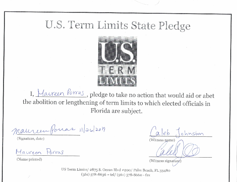 The pledge is provided to candidates and elected officials statewide. It reads, “I pledge to take no action that would aid or abet the abolition or lengthening of term limits to which elected officials in Florida are subject.”