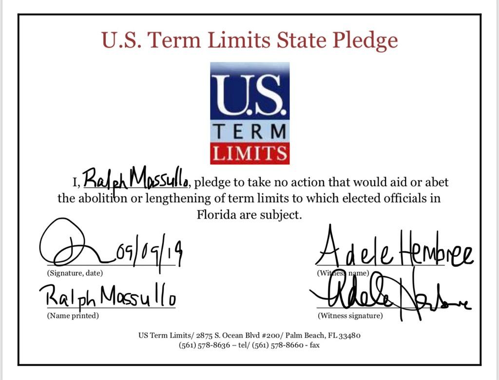 USTL President, Philip Blumel, commented on Massullo’s pledge saying, “Ralph’s support of term limits shows that there are individuals who are willing to listen to the majority of voters who want term limits. The people are best served by citizen legislators, not career politicians.”
