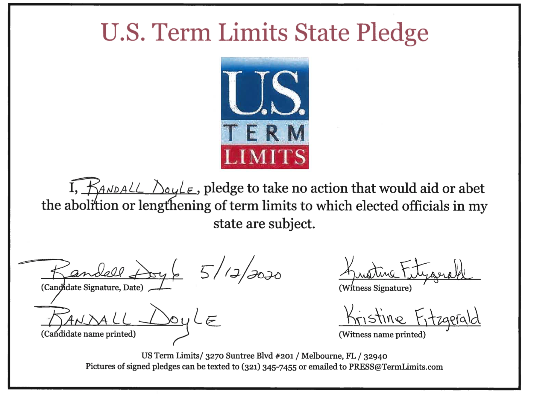 U.S. Term Limits Praises Randall Doyle for Signing Pledge