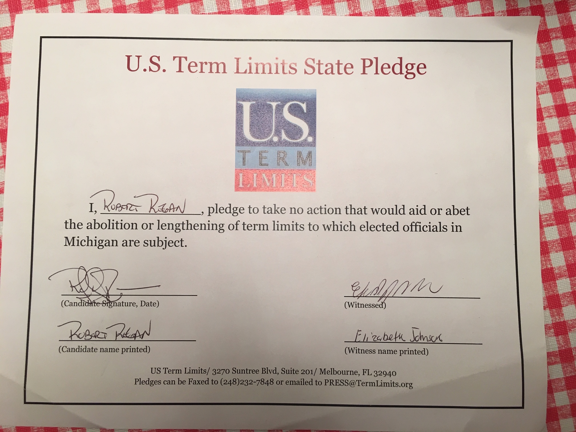 Lansing, MI – U.S. Term Limits (USTL), the leader in the national, non-partisan movement to limit terms for elected officials, is gathering support from elected officials across Michigan. Its mission is to advocate for term limits on all elected officials. State house candidate, Robert Regan of district 73, has committed to defend term limits in Michigan by signing the term limits pledge.