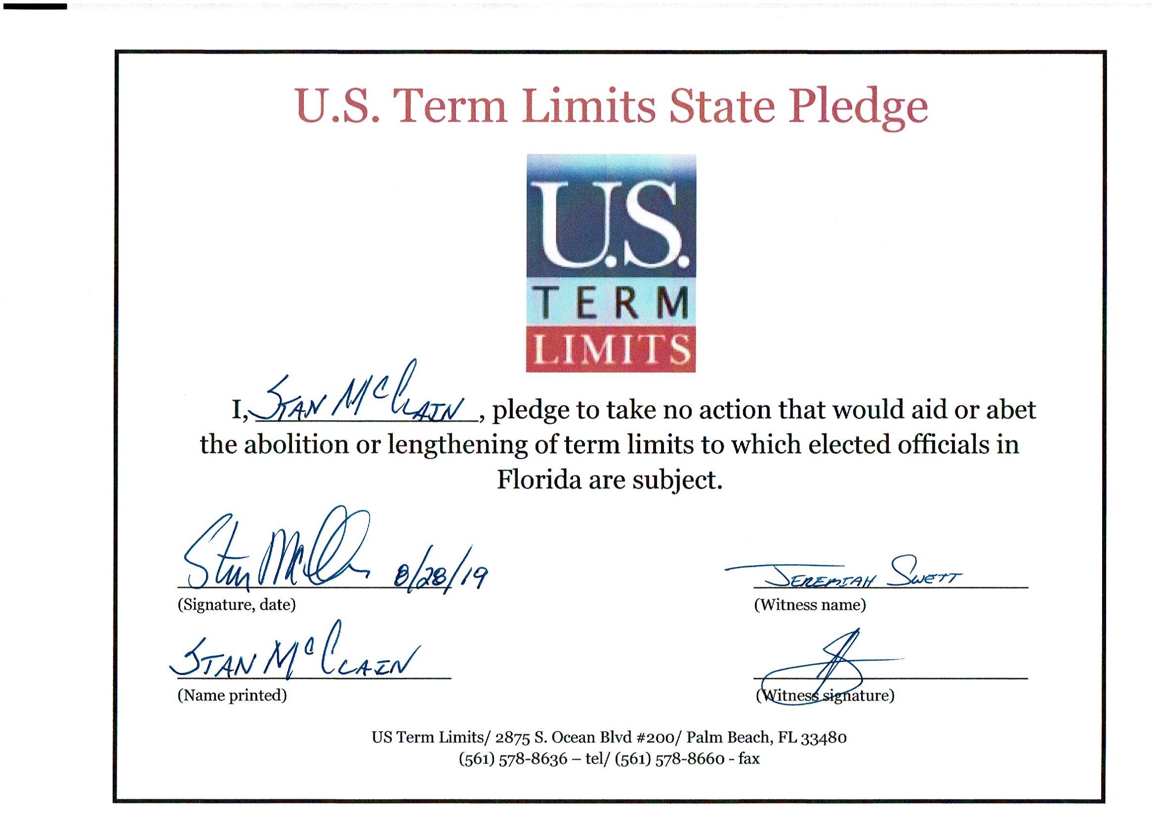 USTL President, Philip Blumel, commented on McClain’s pledge saying, “Stan’s support of term limits shows that there are individuals who are willing to listen to the majority of voters who want term limits. The people are best served by citizen legislators, not career politicians.”