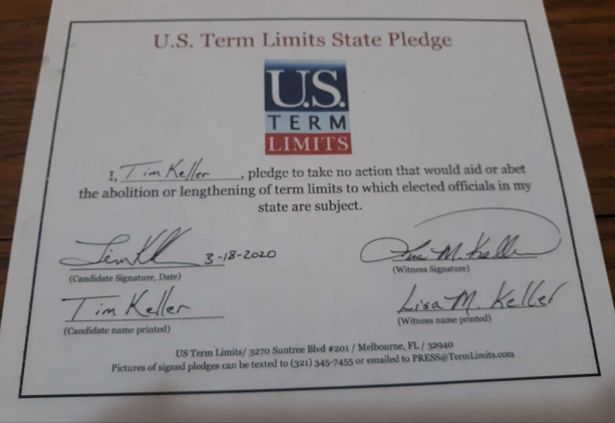 USTL President, Philip Blumel, commented on Keller’s pledge saying, “Tim’s support of term limits shows that there are individuals who are willing to listen to the majority of voters who want term limits. The people are best served by citizen legislators, not career politicians.”