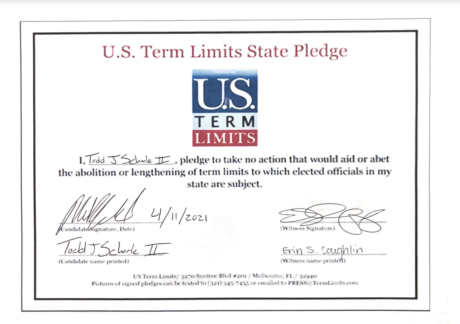 U.S. Term Limits Praises Todd Schorle for Signing Pledge