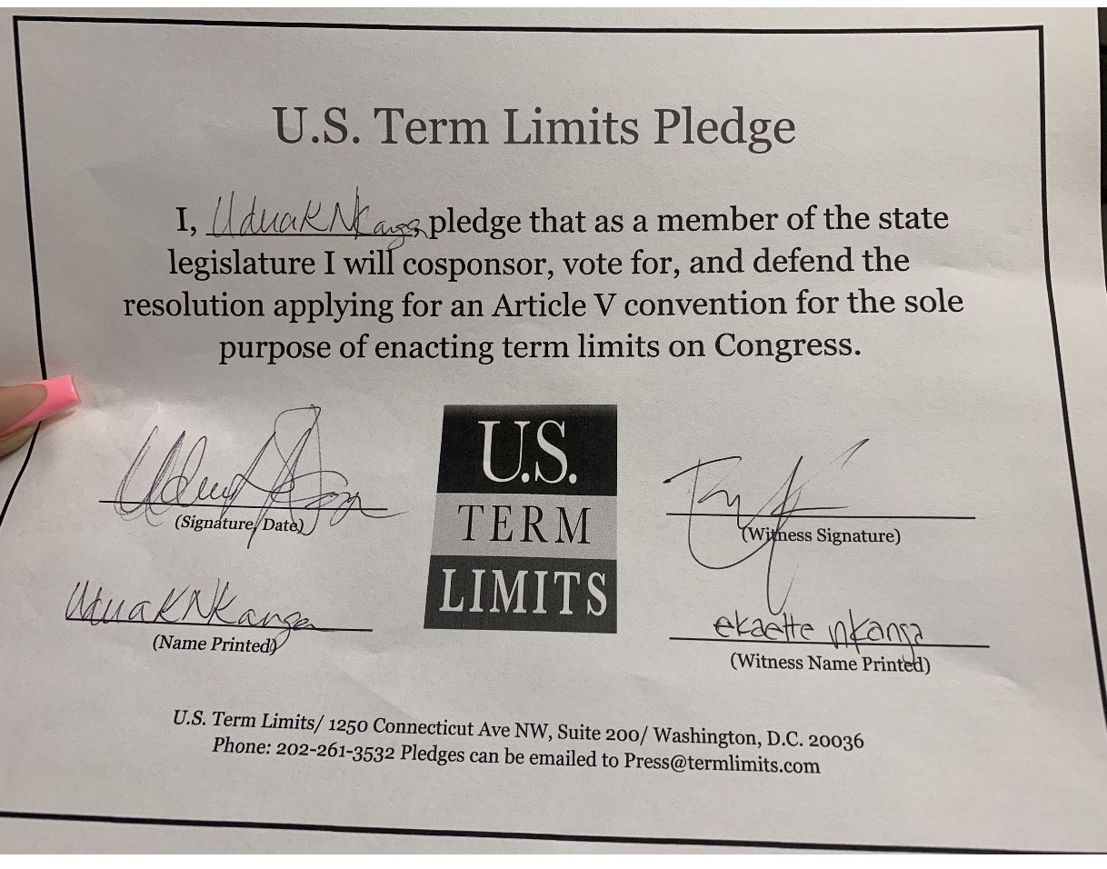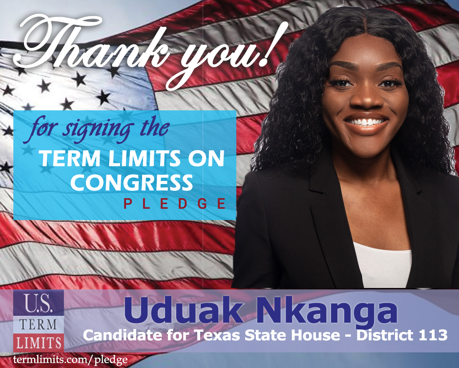 Dallas, TX – U.S. Term Limits (USTL), the leader in the national, non-partisan movement to limit terms for elected officials, is gathering support from state lawmakers across the nation. Its mission is to get 34 states to apply for an amendment proposal convention specific to term limits on Congress. Texas state house candidate, Uduak Nkanga (district 113) has committed support for term limits on Congress by signing the Term Limits Convention pledge. Nkanga is the first signer in this race.