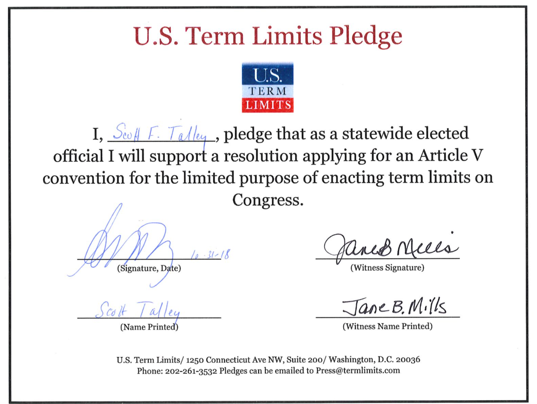 U.S. Term Limits Praises Senator Scott Talley for Signing Pledge