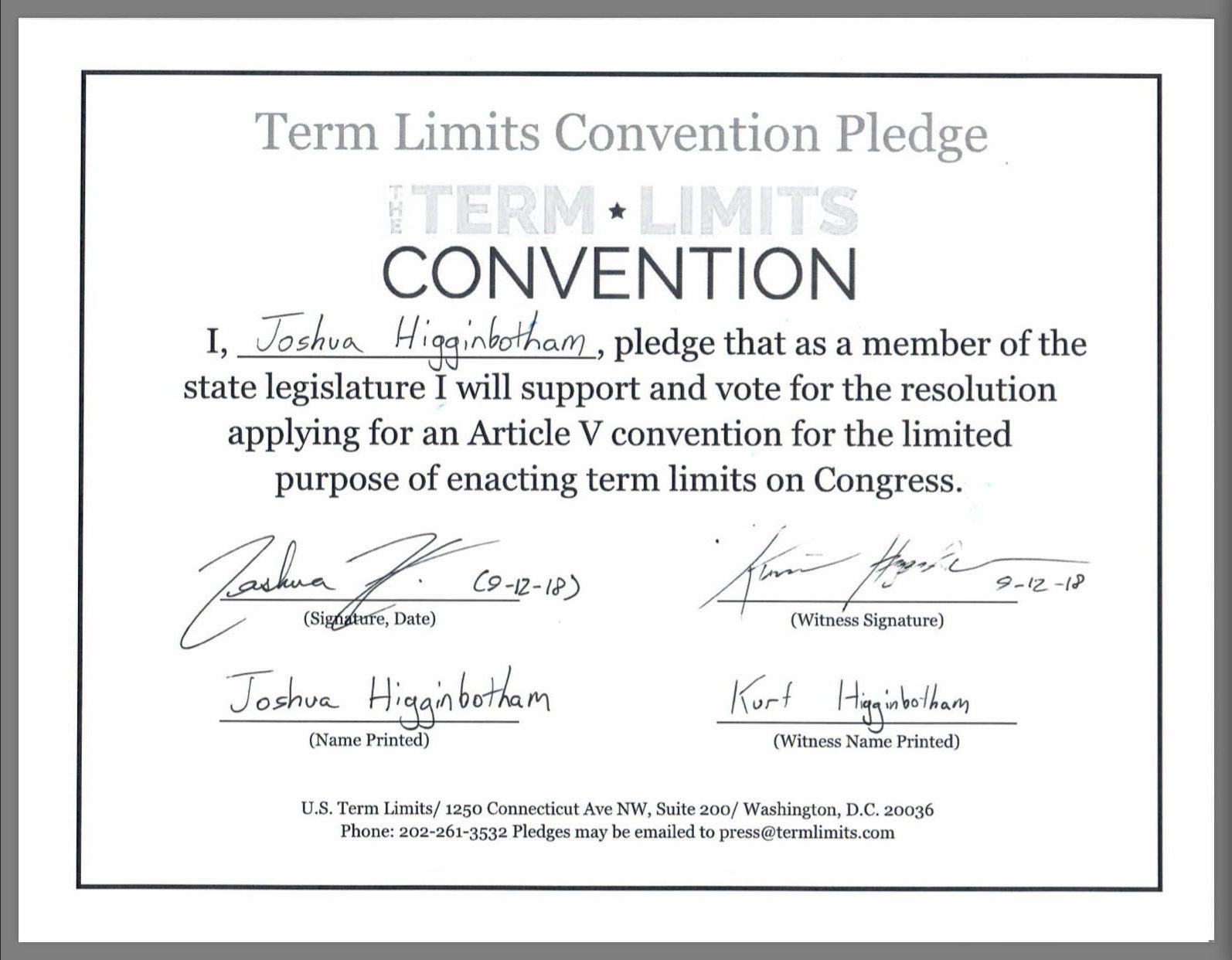 Washington, D.C. – U.S. Term Limits (USTL), the leader in the national, non-partisan movement to limit terms for elected officials, is gathering support from state lawmakers across the nation. Its mission is to get 34 states to apply for an amendment proposal convention specific to term limits on Congress. West Virginia House Delegate candidate, Joshua Higginbotham of district 13, has committed his support for term limits on Congress by signing the Term Limits Convention pledge. Previously, candidate, Scott Cadle also committed to signing the pledge.