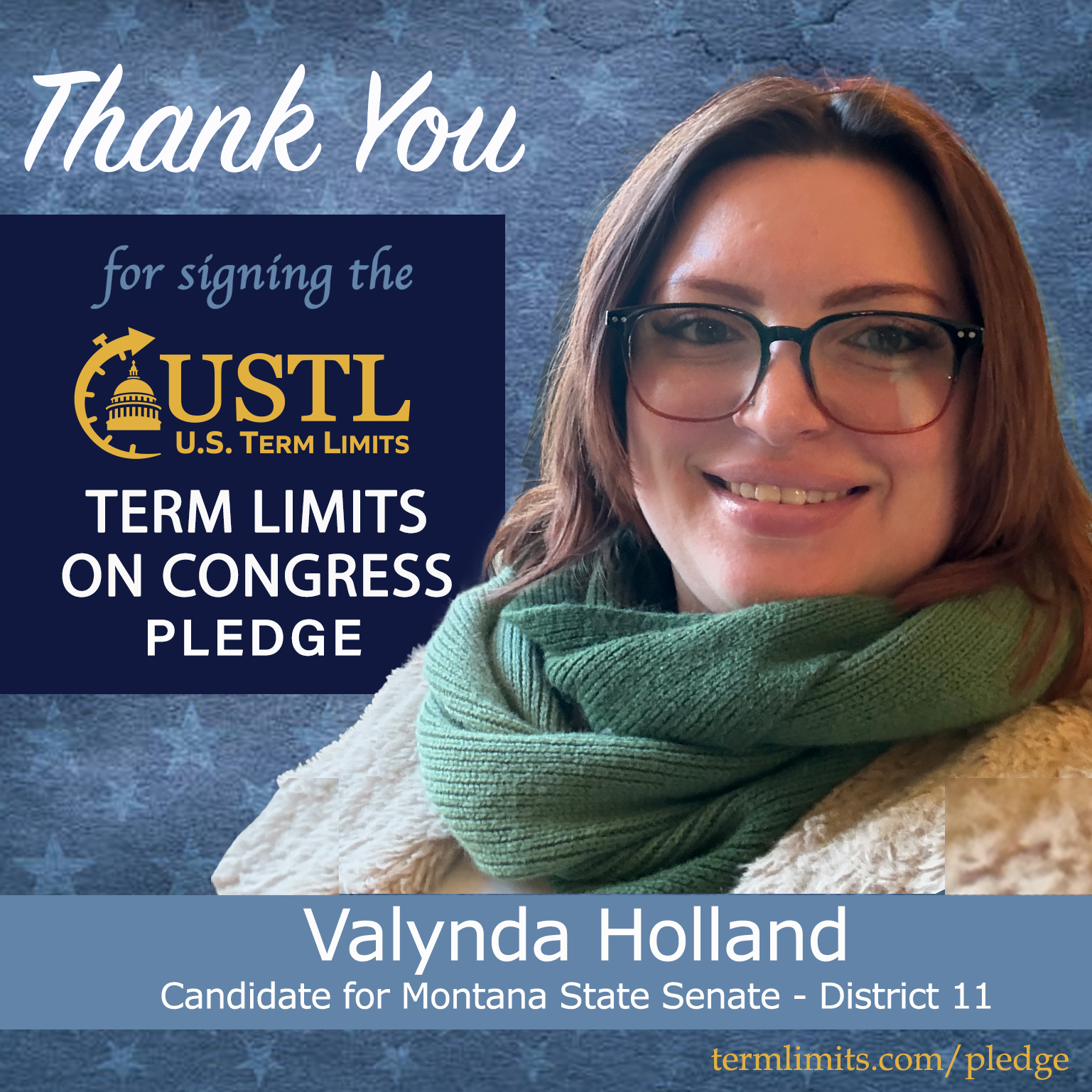 Great Falls, MT – U.S. Term Limits (USTL), the leader in the national, non-partisan movement to limit terms for elected officials, is gathering support from state lawmakers across the nation. Its mission is to get 34 states to apply for an amendment proposal convention specific to term limits on Congress. 2026 Montana state senate candidate, Valynda Holland (district 11), has committed support for term limits on Congress by signing the term limits convention pledge.