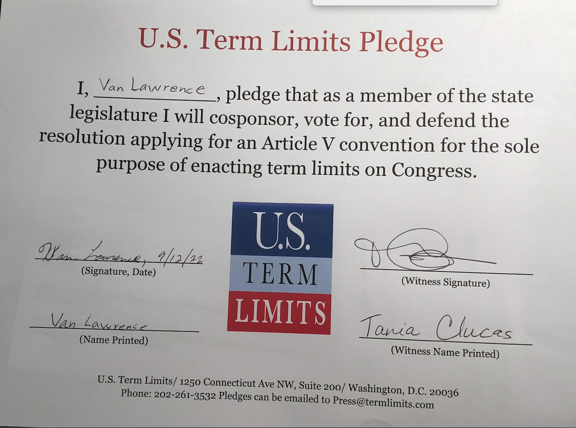 USTL President, Philip Blumel, commented on Lawrence’s pledge saying, “Van’s support of term limits shows that there are individuals who are willing to listen to the majority of voters who want term limits. America needs a Congress that will be served by citizen legislators, not career politicians.”