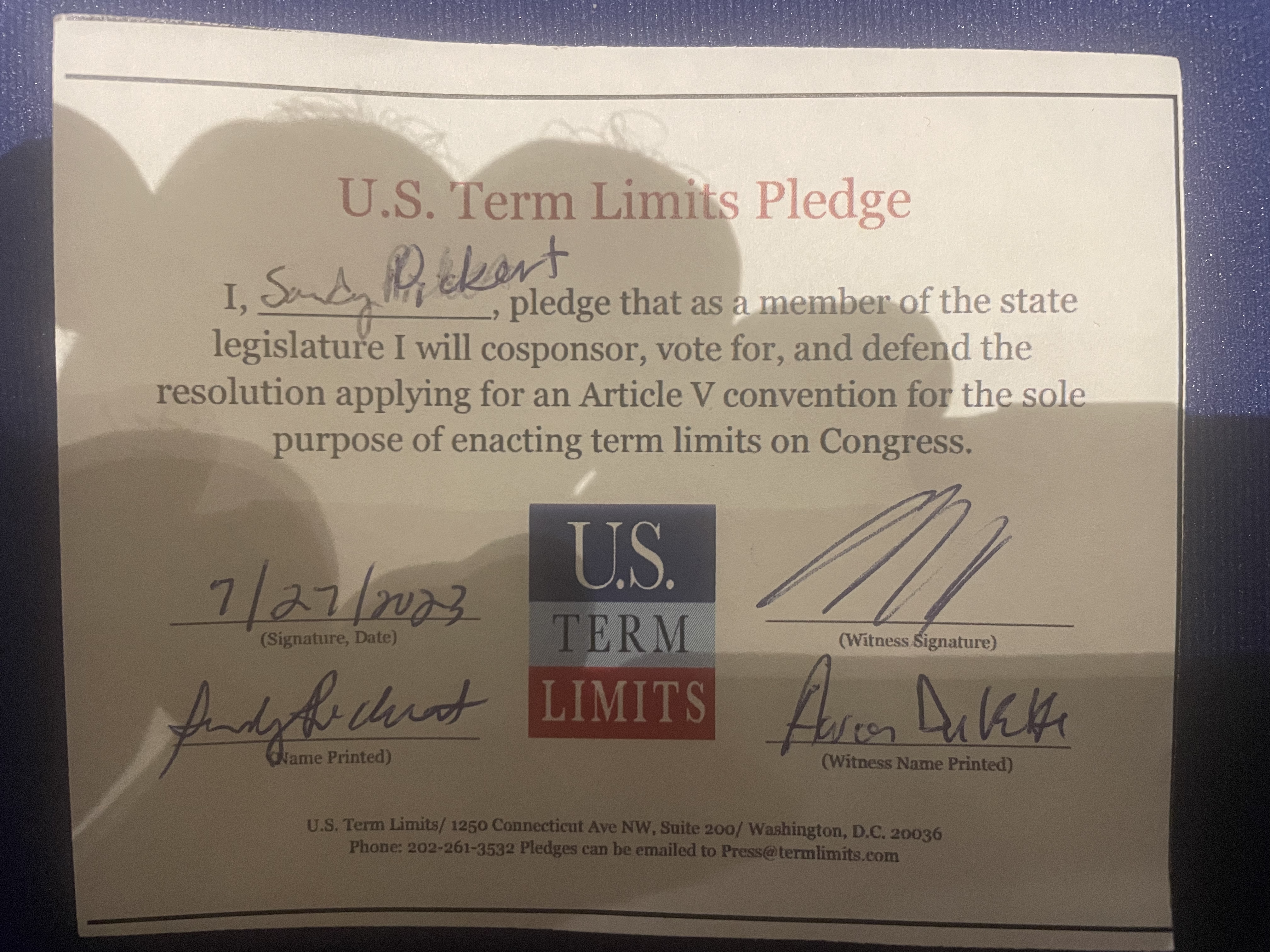 The U.S. Term Limits pledge is provided to candidates and members of state legislatures. It reads, “I pledge that, as a member of the state legislature, I will cosponsor, vote for, and defend the resolution applying for an Article V convention for the sole purpose of enacting term limits on Congress.”