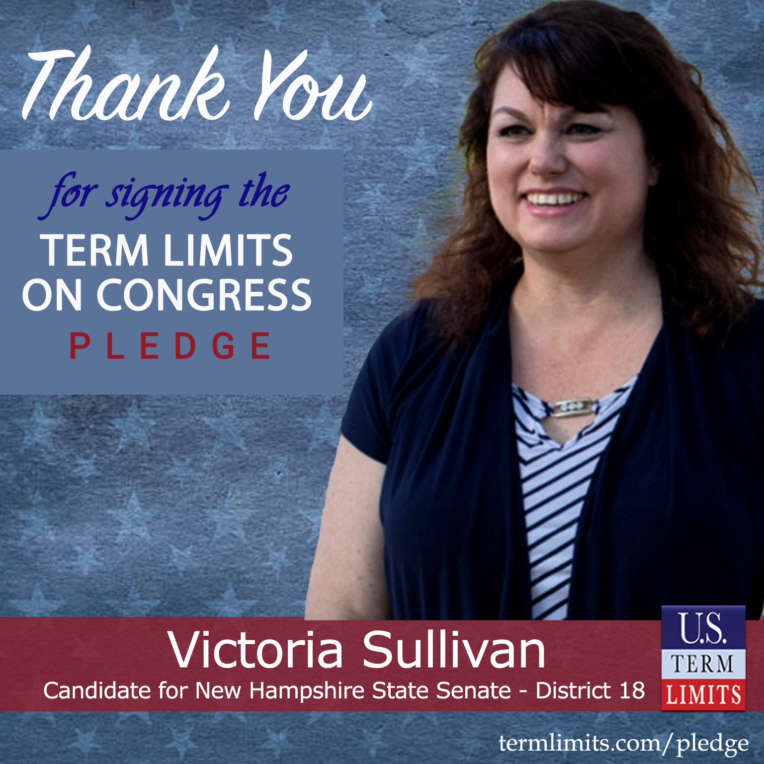 Manchester, NH – U.S. Term Limits (USTL), the leader in the national, non-partisan movement to limit terms for elected officials, is gathering support from state lawmakers across the nation. Its mission is to get 34 states to apply for an amendment proposal convention specific to term limits on Congress. New Hampshire state senate candidate, Victoria Sullivan (District 18), has committed support for term limits on Congress by signing the term limits convention pledge.