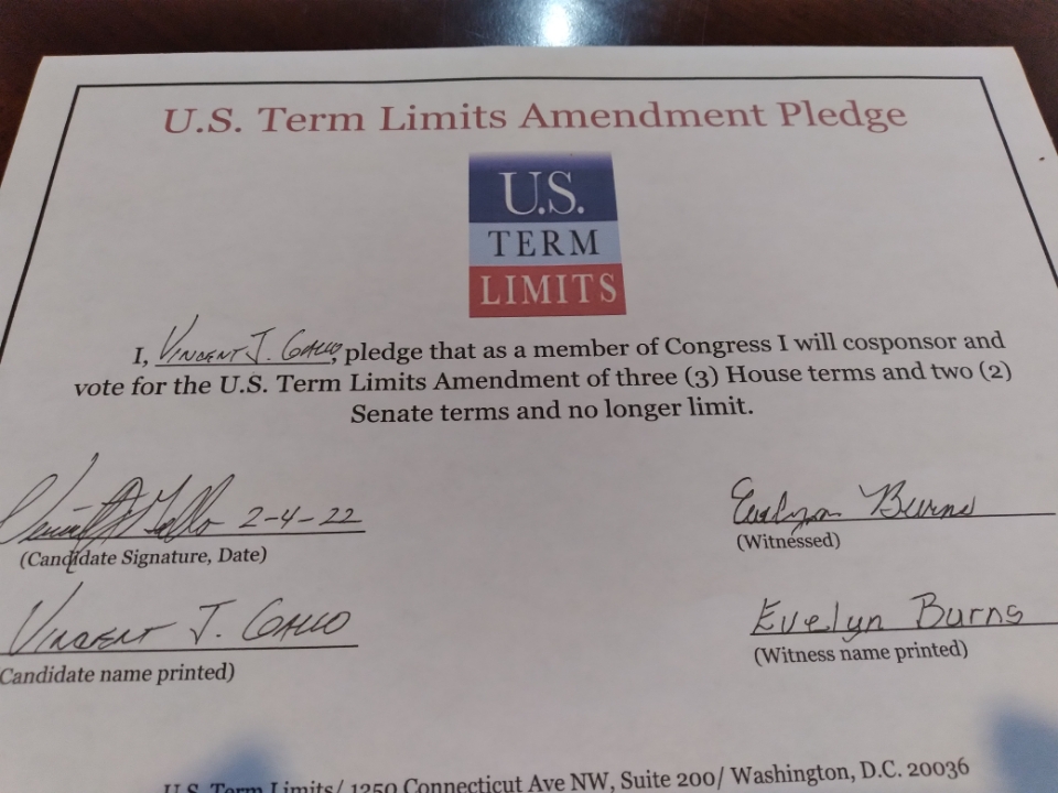 Washington D.C. – U.S. Term Limits (USTL), the leader in the non-partisan national movement to limit terms for elected officials, praises 2022 U.S. house candidate for Texas, Vince Gallo (district 26), for signing the pledge for an amendment to term limit Congress. Previously, Brian Brazeal also signed the pledge.