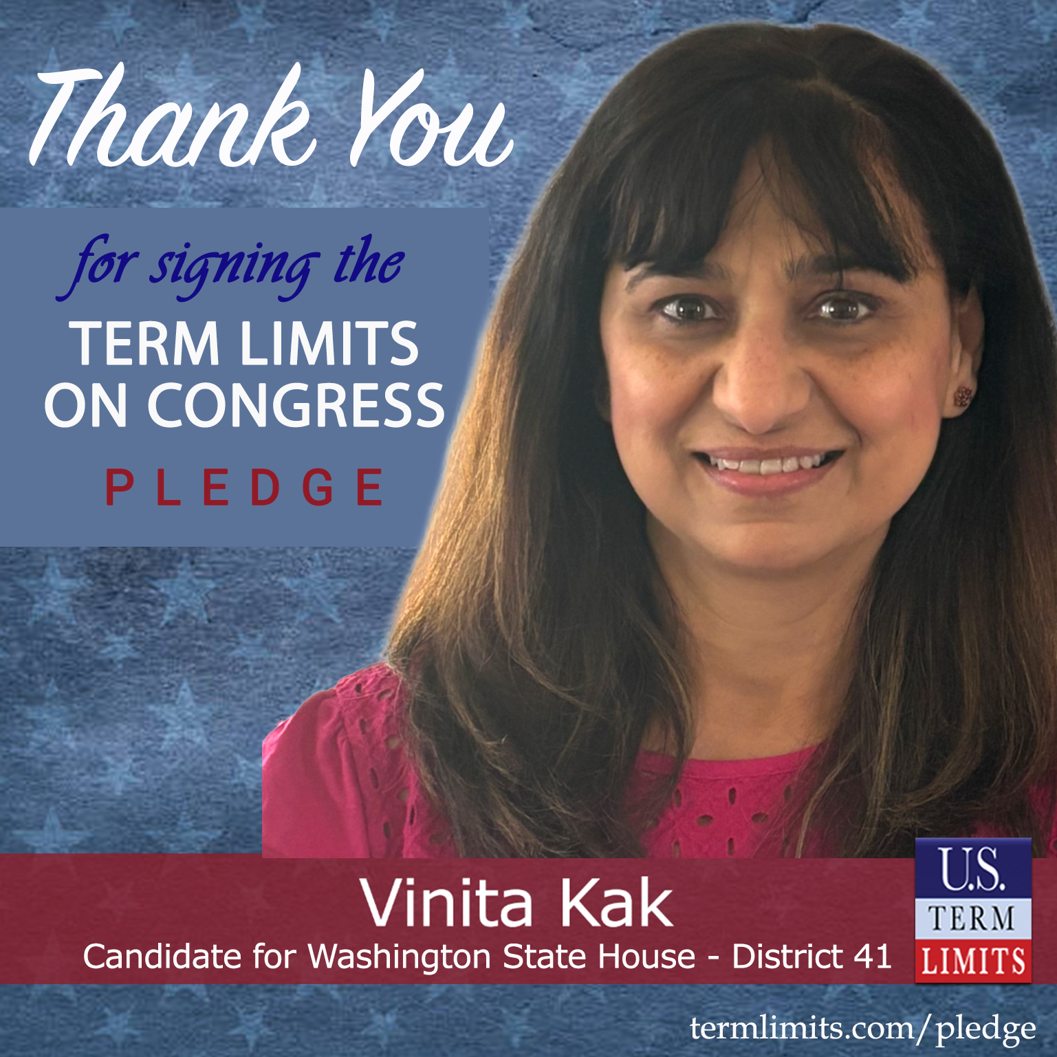 Olympia, WA – U.S. Term Limits (USTL), the leader in the national, non-partisan movement to limit terms for elected officials, is gathering support from state lawmakers across the nation. Its mission is to get 34 states to apply for an amendment proposal convention specific to term limits on Congress. 2025 Washington state house candidate, Vinita Kak (district 41-position 1), has committed support for term limits on Congress by signing the term limits convention pledge. Kak is the first signer in this race. The primary special election is scheduled for August 5, 2025.