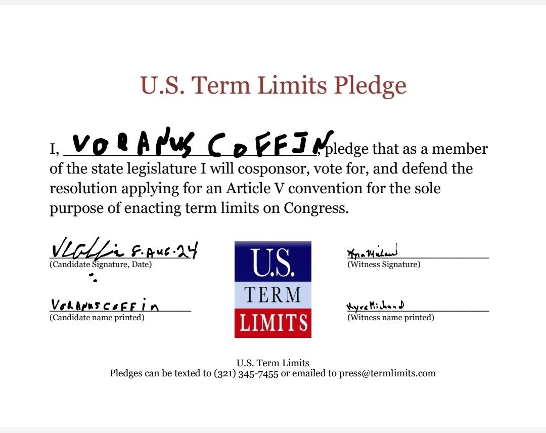 USTL President, Philip Blumel, commented on VL’s pledge saying, “Coffin’s strong support of term limits shows that there are individuals who are willing to listen to the majority of voters who want term limits. America needs a Congress that will be served by citizen legislators, not career politicians.”