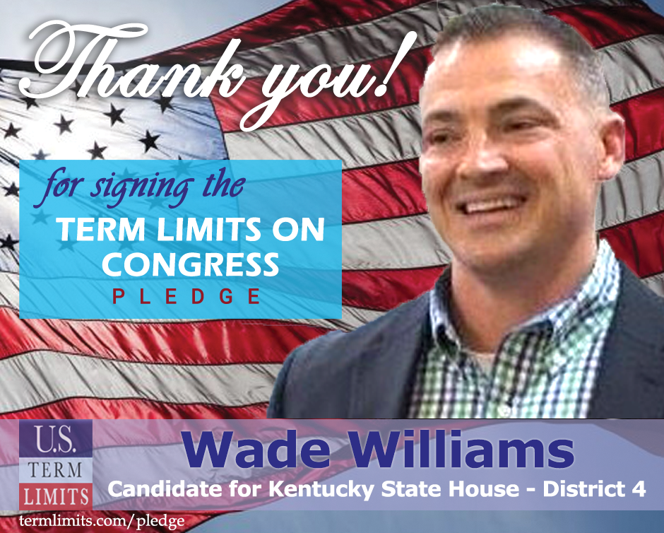Clarksville, KY – U.S. Term Limits (USTL), the leader in the national, non-partisan movement to limit terms for elected officials, is gathering support from state lawmakers across the nation. Its mission is to get 34 states to apply for an amendment proposal convention specific to term limits on Congress. Kentucky state house candidate, Wade Williams (district 4), has committed support for term limits on Congress by signing the Term Limits Convention pledge. Previously, candidate David Sharp also signed the pledge.