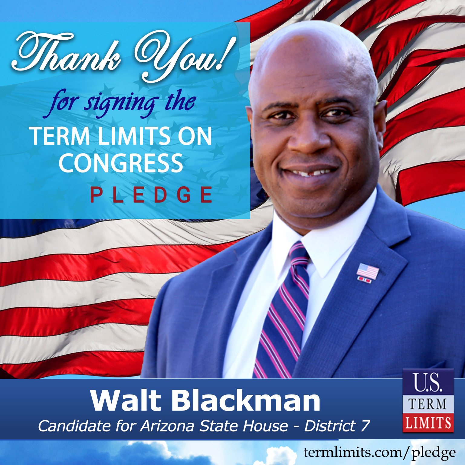 Flagstaff, AZ – U.S. Term Limits (USTL), the leader in the national, non-partisan movement to limit terms for elected officials, is gathering support from state lawmakers across the nation. Its mission is to get 34 states to apply for an amendment proposal convention specific to term limits on Congress. Arizona state house candidate, Walt Blackman (District 7), has committed support for term limits on Congress by signing the term limits convention pledge.