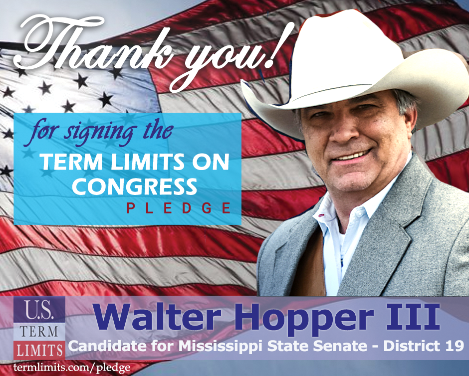 Olive Branch, MS – U.S. Term Limits (USTL), the leader in the national, non-partisan movement to limit terms for elected officials, is gathering support from state lawmakers across the nation. Its mission is to get 34 states to apply for an amendment proposal convention specific to term limits on Congress. Mississippi state senate candidate, Walter Hopper III (district 19), has committed support for term limits on Congress by signing the Term Limits Convention pledge. Previously, Senator Kevin Blackwell also signed the pledge.