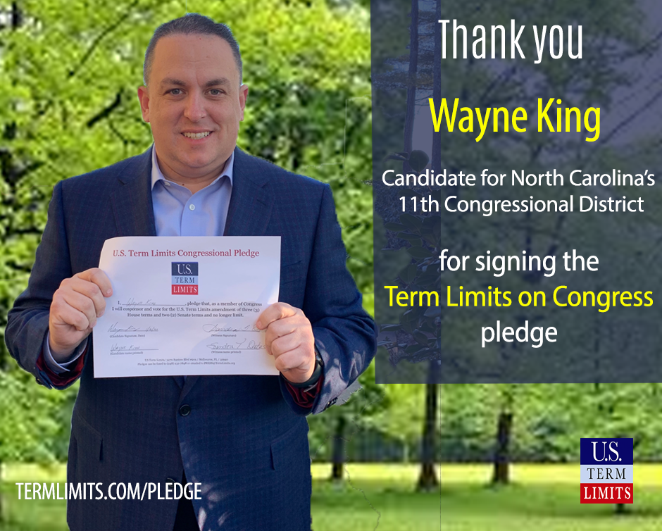 Washington, DC – U.S. Term Limits (USTL), the leader in the non-partisan national movement to limit terms for elected officials, praises 2020 U.S. house candidate for North Carolina (district 11), Wayne King, for signing the pledge for an amendment to term limit Congress. Previously, Lynda Bennett also signed the pledge. The NC CD-11 election is scheduled for March 3, 2020.