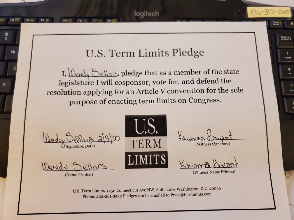 Washington, D.C. – U.S. Term Limits (USTL), the leader in the national, non-partisan movement to limit terms for elected officials, is gathering support from state lawmakers across the nation. Its mission is to get 34 states to apply for an amendment proposal convention specific to term limits on Congress. 2020 North Carolina state house candidate, Wendy Sellars , (district 80), has committed support for term limits on Congress by signing the Term Limits Convention pledge. Previously, Roger Younts also signed the pledge. The primary election is scheduled for March 3, 2020.